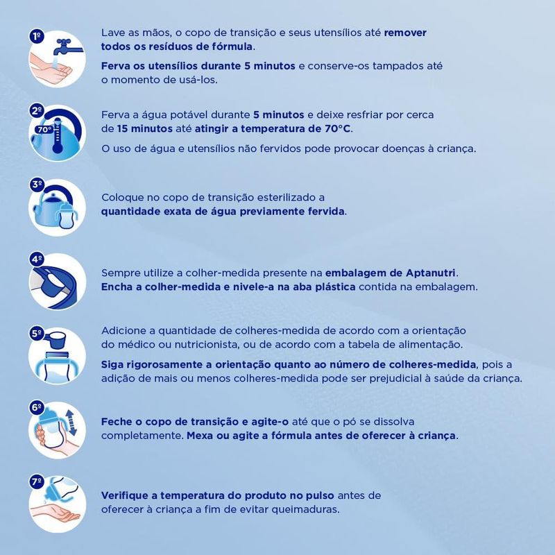 A Fórmula Infantil Aptanutri Premium + 3 é uma excelente opção para a alimentação de bebês e crianças pequenas. Desenvolvida com prebióticos (GOS/FOS), DHA e ARA, e nucleotídeos, essa fórmula é essencial para o crescimento saudável dos pequenos. Disponível em embalagem de 800g em pó, cada unidade acompanha uma colher-medida para facilitar o preparo. Benefícios da Fórmula Infantil Aptanutri Premium 3 com 800g Embora o leite materno seja insubstituível nos primeiros meses de vida, a Fórmula Infantil Aptanutri Premium 3 é uma alternativa ideal para crianças a partir dos 12 meses de idade. Ela complementa o leite materno, fornece nutrientes essenciais para o desenvolvimento saudável dos bebês. Diferença entre leite em pó, composto lácteo e fórmula infantil O leite em pó é uma versão desidratada do leite de vaca, mantendo seus nutrientes. Os compostos lácteos incluem ingredientes adicionais além do leite. Já as fórmulas infantis são suplementos que se assemelham ao leite materno, adaptando sua composição para atender às necessidades dos bebês. Instruções para o uso da Fórmula Infantil Aptanutri Premium 3 com 800g Lave e esterilize todas as utensílios antes de prepará-las.Ferva água potável e deixe esfriar até atingir 70ºC.Adicione a quantidade correta de água na mamadeira esterilizada.Utilize uma colher-medida para adicionar a quantidade adequada de fórmula.Agite bem até que o pó se dissolva completamente.Verifique a temperatura antes de oferecer ao bebê.Recomendações importantes e conservação Após o preparo, consuma imediatamente ou leve à geladeira por até 24 horas. Descarte os restos não consumidos. Mantenha a lata bem fechada em locais frescos e secos, e utilize talheres limpos e secos. Não utilize se o lacre estiver violado. Ingredientes da Fórmula Infantil Aptanutri Premium 3 com 800g A fórmula contém lactose, óleos vegetais, leite desnatado, proteína do soro de leite, fibras alimentares, minerais, vitaminas e outros nutrientes essenciais para o desenvolvimento infantil.