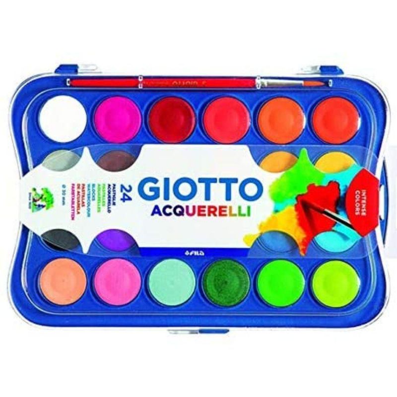 Aquarela Em Pastilha Acquarelli 24 Cores GiottoA marca Giotto pertence ao grupo Fila Canson que é mundialmente conhecido pela qualidade de seus produtos. Com o kit de 24 pastilhas + pincel, não seria diferente!Acondicionado em um lindo estojo é ideal para utilizar sem precisar tirar da embalagem, com uma tampa de palete e um design que evita que a água se espalhe. São 24 pastilhas com 24 cores diferentes em cores intensas e vivas!Não recomendado para menores de 3 anos.Conteúdo da embalagem:24 pastilhas sendo 24 cores diferentes;1 Pincel com cerdas sintéticas de alta qualidade;1 Estojo com tampa palete.Acompanha o produto: - 1 Aquarela em Pastilha Acquarelli 24 Cores GIOTTO : - 7 dias Contra Defeitos de Fabricação