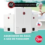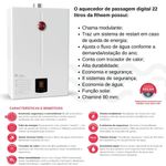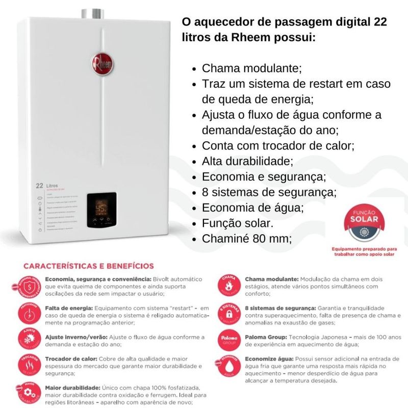 A linha de aquecedores de passagem digitais da Rheem são reconhecidos pela sua alta tecnologia.O aquecedor de passagem a gás Rheem de 22 litros GN é a opção ideal para uso residencial e comercial.Atende 3 pontos de consumo simultaneamente, 2 duchas de 8 l/min e 1 torneira de 4 l/min, conta com opção inverno/verão com ajuste de fluxo de água conforme a demanda e a estação do ano.Segurança em primeiro lugar. Produzido com 8 sistemas de segurança, garante tranquilidade contra superaquecimento, falta de presença de chama e gás e anomalias na exaustão dos gases, cortando imediatamente a chama caso sejam detectadas Irregularidades em seu funcionamento. tem, ainda, certificação do inmetro com classificação a, concedida aos equipamentos com maior eficiência energéticaOferece o que existe de melhor para seu conforto e sua família.Modulação de chama em dois estágios, atendendo vários pontos simultâneos com conforto;Equipamento com sistema “restart” em caso de queda de energia, o sistema é religado automaticamente na programação anterior;Ajuste o fluxo de água conforme a demanda e estação do ano;Cobre de alta qualidade que garante maior durabilidade e segurança;Único com chapa 100% fosfatizada, que garante maior durabilidade contra oxidação e ferrugem. Aparelho sempre com aparência de novo;Possui bivolt automático 110 ~ 220V que evita queima de componente e ainda suporta oscilações da rede sem impactar o usuário;Garantia e tranquilidade contra superaquecimento, falta de presença de chama e anomalias na exaustão de gases pois possui 8 sistemas de segurança;Sensor adicional na entrada de água fria, que garante uma resposta mais rápida no aquecimento, menor desperdício de água para alcançar a temperatura desejada;Tecnologia japonesa com mais de 100 anos de experiência em aquecimento de água.Importante: Antes de adquirir seu equipamento, tenha certeza de que sua estrutura de água e gás são compatíveis com o a capacidade do aparelho que está sendo adquirido. Tipo de gás: GNCaracterísticas do produto:Quantidade de temperaturas: 38°c até 65°cPressão de funcionamento: 10 m.c.aPotência: 36,0 kWRendimento sobre o p.c.s (%): 85%Comando eletrônico de temperaturas: simConsumo de gás (m3/h): 3,25Vazão de água com t 20º (l/min): 3,5 l/mimPressão mínima de água (mca): 2Pressão máxima de água (mca): 100Conexões para ligação do gás e água (polegada): 1/2Alimentação de energia: 127/220VConsumo de energia: 48WDiâmetro da chaminé (mm): 80mmClassificação Inmetro: ATem dispositivo de segurança: simTem seletor de temperatura: simModelo digitalMaterial:Caixa em metálica 100 % fosfatizadaTrocador de calor em cobreVálvula de gás em alumínioConexões de entrada e saída em liga de latãoSensor de fluxo em poliamidaCor: BrancoItens inclusos:1 aquecedor de água1 manual de garantiaDimensões do produto:Altura(cm): 57,00Largura(cm): 38,00Profundidade(cm): 16,50Peso(kg): 12,50