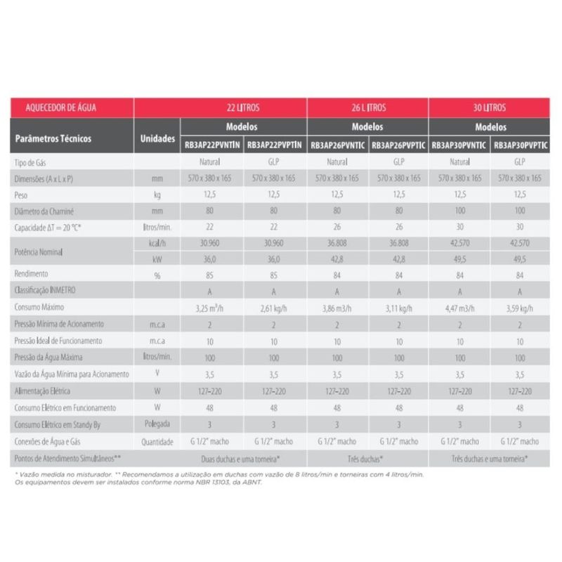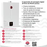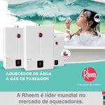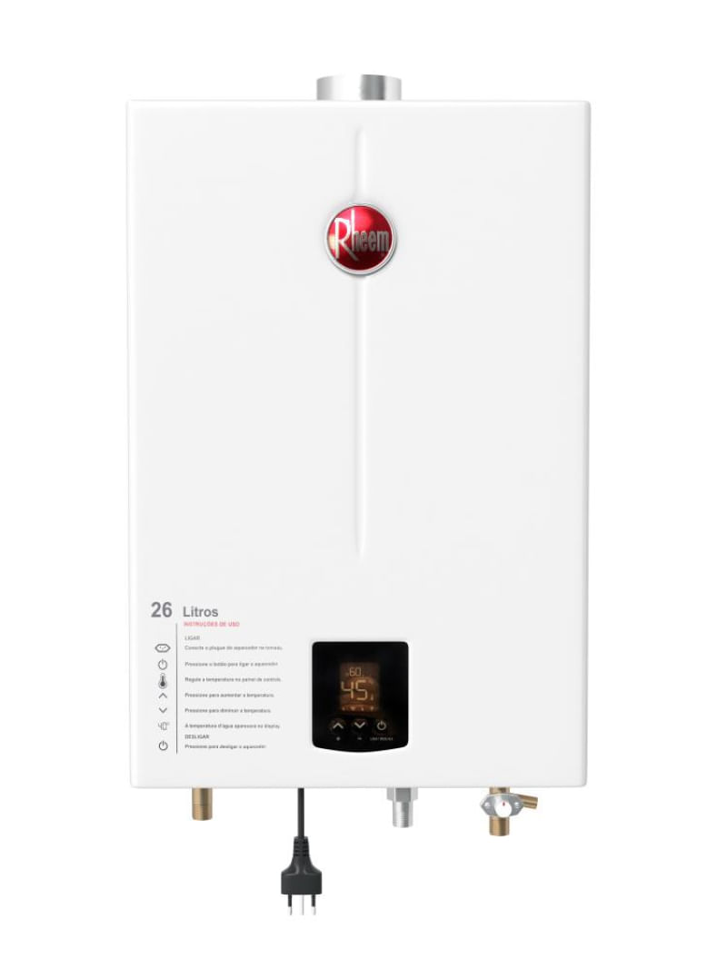 A linha de aquecedores de passagem digitais da Rheem são reconhecidos pela sua alta tecnologia.O aquecedor de passagem a gás Rheem de 26 litros GLP (Gás de Botijão) é a opção ideal para uso residencial e comercial.Atende 3 pontos de consumo simultaneamente, 3 duchas de 8 l/min, conta com opção inverno/verão com ajuste de fluxo de água conforme a demanda e a estação do ano.Segurança em primeiro lugar. Produzido com 8 sistemas de segurança, garante tranquilidade contra superaquecimento, falta de presença de chama e gás e anomalias na exaustão dos gases, cortando imediatamente a chama caso sejam detectadas Irregularidades em seu funcionamento. tem, ainda, certificação do inmetro com classificação a, concedida aos equipamentos com maior eficiência energéticaOferece o que existe de melhor para seu conforto e sua família.Modulação de chama em dois estágios, atendendo vários pontos simultâneos com conforto;Equipamento com sistema “restart” em caso de queda de energia, o sistema é religado automaticamente na programação anterior;Ajuste o fluxo de água conforme a demanda e estação do ano;Cobre de alta qualidade que garante maior durabilidade e segurança;Único com chapa 100% fosfatizada, que garante maior durabilidade contra oxidação e ferrugem. Aparelho sempre com aparência de novo;Possui bivolt automático 110 ~ 220V que evita queima de componente e ainda suporta oscilações da rede sem impactar o usuário;Garantia e tranquilidade contra superaquecimento, falta de presença de chama e anomalias na exaustão de gases pois possui 8 sistemas de segurança;Sensor adicional na entrada de água fria, que garante uma resposta mais rápida no aquecimento, menor desperdício de água para alcançar a temperatura desejada;Tecnologia japonesa com mais de 100 anos de experiência em aquecimento de água.Importante: Antes de adquirir seu equipamento, tenha certeza de que sua estrutura de água e gás são compatíveis com o a capacidade do aparelho que está sendo adquirido. Tipo de gás: GLP (Gás de Botijão)Características do produto:Quantidade de temperaturas: 38°c até 65°cPressão de funcionamento: 10 m.c.aPotência: 42,8 kWRendimento sobre o p.c.s (%): 84%Comando eletrônico de temperaturas: simConsumo de gás (kg/h): 3,11Vazão de água com t 20º (l/min): 3,5 l/mimPressão mínima de água (mca): 2Pressão máxima de água (mca): 100Conexões para ligação do gás e água (polegada): 1/2Alimentação de energia: 127/220VConsumo de energia: 48WDiâmetro da chaminé (mm): 80mmClassificação Inmetro: ATem dispositivo de segurança: simTem seletor de temperatura: simModelo digital Material:Caixa em metálica 100 % fosfatizadaTrocador de calor em cobreVálvula de gás em alumínioConexões de entrada e saída em liga de latãoSensor de fluxo em poliamidaCor: BrancoItens inclusos:1 aquecedor de água1 manual de garantiaDimensões do produto:Altura(cm): 57,00Largura(cm): 38,00Profundidade(cm): 16,50Peso(kg): 12,50