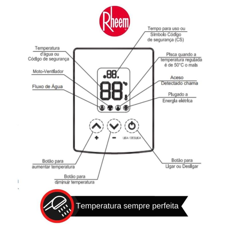 A linha de aquecedores de passagem digitais da Rheem são reconhecidos pela sua alta tecnologia.O aquecedor de passagem a gás Rheem de 30 litros GLP (Gás de botijão) é a opção ideal para uso residencial e comercial.Atende 4 pontos de consumo simultaneamente, 3 duchas de 8 l/min e 1 torneira de 4 l/min, conta com opção inverno/verão com ajuste de fluxo de água conforme a demanda e a estação do ano. Segurança em primeiro lugar. Produzido com 8 sistemas de segurança, garante tranquilidade contra superaquecimento, falta de presença de chama e gás e anomalias na exaustão dos gases, cortando imediatamente a chama caso sejam detectadas Irregularidades em seu funcionamento. tem, ainda, certificação do inmetro com classificação a, concedida aos equipamentos com maior eficiência energéticaOferece o que existe de melhor para seu conforto e sua família.Modulação de chama em dois estágios, atendendo vários pontos simultâneos com conforto;Equipamento com sistema “restart” em caso de queda de energia, o sistema é religado automaticamente na programação anterior;Ajuste o fluxo de água conforme a demanda e estação do ano;Cobre de alta qualidade que garante maior durabilidade e segurança;Único com chapa 100% fosfatizada, que garante maior durabilidade contra oxidação e ferrugem. Aparelho sempre com aparência de novo;Possui bivolt automático 110 ~ 220V que evita queima de componente e ainda suporta oscilações da rede sem impactar o usuário;Garantia e tranquilidade contra superaquecimento, falta de presença de chama e anomalias na exaustão de gases pois possui 8 sistemas de segurança;Sensor adicional na entrada de água fria, que garante uma resposta mais rápida no aquecimento, menor desperdício de água para alcançar a temperatura desejada;Tecnologia japonesa com mais de 100 anos de experiência em aquecimento de água.Importante: Antes de adquirir seu equipamento, tenha certeza de que sua estrutura de água e gás são compatíveis com o a capacidade do aparelho que está sendo adquirido. Tipo de gás: GLP (Gás de botijão)Características do produto:Quantidade de temperaturas: 38°c até 65°cPressão de funcionamento: 10 m.c.aPotência: 49,5 kWRendimento sobre o p.c.s (%): 84%Comando eletrônico de temperaturas: simConsumo de gás (kg/h): 3,59Vazão de água com t 20º (l/min): 3,5 l/mimPressão mínima de água (mca): 2Pressão máxima de água (mca): 100Conexões para ligação do gás e água (polegada): 1/2Alimentação de energia: 127/220VConsumo de energia: 48WDiâmetro da chaminé (mm): 100 mmClassificação Inmetro: ATem dispositivo de segurança: simTem seletor de temperatura: simMaterial:Caixa em metálica 100 % fosfatizadaTrocador de calor em cobreVálvula de gás em alumínioConexões de entrada e saída em liga de latãoSensor de fluxo em poliamidaCor: BrancoItens inclusos:1 aquecedor de água1 manual de garantiaDimensões do produto:Altura(cm): 57,00Largura(cm): 38,00Profundidade(cm): 16,50Peso(kg): 12,50