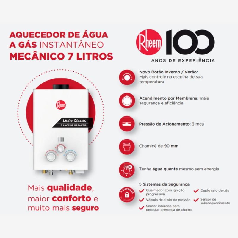 A linha de aquecedores de passagem digitais da Rheem são reconhecidos pela sua alta tecnologia.O aquecedor a gás Rheem de 7 litros GN (Gás Natural) é perfeito para quem busca um banho confortável e com controle de temperatura na medida certa. Com tecnologia avançada e acendimento por membrana, ele oferece segurança e qualidade Rheem, líder mundial no setor.Ideal para residências, apartamentos e espaços compactos, esse modelo garante água quente na hora que você precisa, com garantia e assistência especializada em todo Brasil. Garanta o seu banho do jeito que você merece!Com Capacidade de 7 litros/min e acendimento por membrana que deixa o aparelho mais seguro e eficiente, esse aquecedor tem um design compacto e moderno que conta ainda com Botão Inverno/Verão para um maior controle de temperatura no seu banho. Perfeito para ambientes com demanda de até 7 litros por minuto de água quenteImportante: Antes de adquirir seu equipamento, tenha certeza de que sua estrutura de água e gás são compatíveis com o a capacidade do aparelho que está sendo adquirido. Características:Capacidade Delta T 20 °C = 7 l/minRendimento = 84%Consumo Máximo = 1.04 m³/hPressão de gás (dinâmica) = 200 mm.c.aPressão de gás máxima = 250 mm.c.aPressão Mínima de Água para Acionamento (dinâmica) = 3 m.c.aPressão Máxima de Água = 100 m.c.aTemperatura máxima na entrada = 60 CºAlimentação Elétrica (DC) = 2 Pilhas de 1,5 V – Tipo DDiâmetro da Chaminé = 90mmConexões para ligação do gás e água = 1/2 PolegadaTipo de Gás: GN (Gás Natural) Transforme seu banho em um momento de conforto e bem-estar com a qualidade Rheem, referência mundial em aquecimento de água há mais de 100 anos!