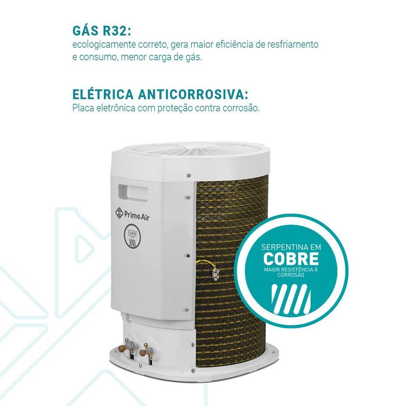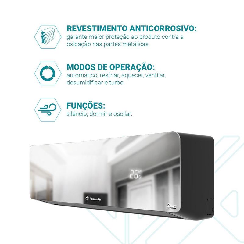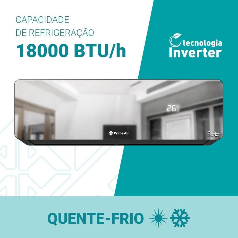 O Ar-Condicionado Prime Air Split Inverter 18000BTUs Quente e Frio 18QG combina tecnologia, potência e sofisticação para entregar climatização eficiente o ano todo. Equipado com tecnologia Eco Inverter, o Ar-Condicionado Prime Air mantém a temperatura estável com até 70% de economia de energia, garantindo conforto contínuo e baixo consumo.O gás ecológico R32 proporciona mais eficiência de resfriamento, reduzindo o impacto ambiental, enquanto a serpentina em cobre e a placa eletrônica anticorrosiva do Ar-Condicionado PAC18QG asseguram maior durabilidade e resistência ao desgaste causado pela umidade.Com classificação energética A, o Ar-Condicionado Prime Air Espelhado entrega excelente desempenho tanto no modo quente quanto frio, e o filtro anti-bactéria lavável melhora a qualidade do ar, oferecendo mais bem-estar. Além disso, conta com funções inteligentes como Dormir, Timer e Oscilar, além de quatro velocidades de ventilação e modos de operação diversos que se adaptam a cada necessidade.Ideal para quem valoriza performance e estilo, o Ar-Condicionado Prime Air Split Inverter 18000BTUs 18QG apresenta um design moderno com painel espelhado, que confere elegância e sofisticação ao ambiente, sem abrir mão da eficiência.Ciclo quente e frioCapacidade de 18000BTUsCompressor hermético rotativo InverterTecnologia Eco Inverter – até 70% de economia de energiaGás ecológico R32Classificação energética ASerpentina em cobre e placa eletrônica anticorrosivaFiltro anti-bactéria lavável e removívelModos: Esfriar, Aquecer, Desumidificar, Ventilar e AutomáticoFunções: Dormir, Timer e OscilarControle de ventilação com 4 velocidades (Alto, Médio, Baixo e Automático)Temperatura ajustável entre 16°C e 32°CVazão máxima de ar: 850m³/hDesign espelhado