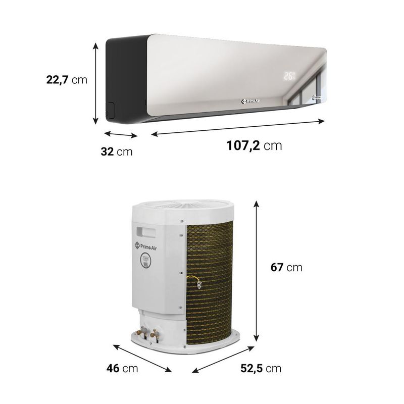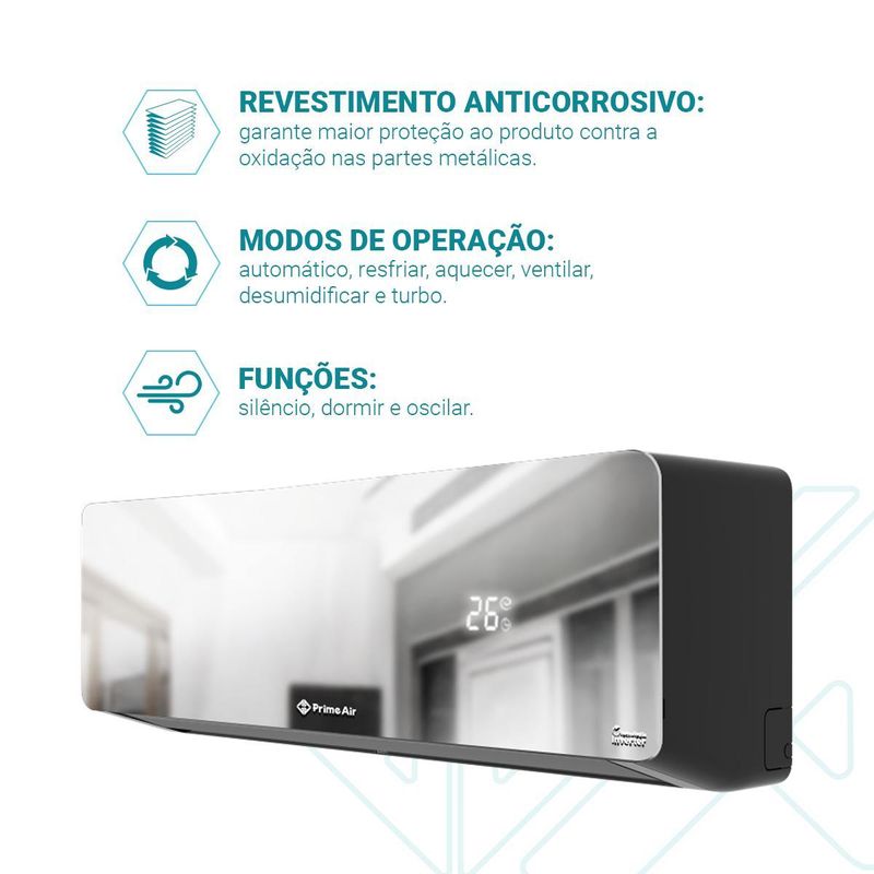 O Ar-Condicionado Prime Air Split Inverter 24000BTUs Quente e Frio 24QG combina potência, economia e sofisticação em um só equipamento. Ideal para climatizar grandes ambientes, o Ar-Condicionado utiliza a tecnologia Eco Inverter, que mantém a temperatura estável com economia de até 70% de energia.Seu funcionamento é mais sustentável graças ao gás ecológico R32, que reduz o impacto ambiental sem comprometer o desempenho. A serpentina em cobre com revestimento anticorrosivo do Ar-Condicionado Espelhado Prime Air garante maior durabilidade, mesmo em regiões úmidas, preservando a eficiência por muito mais tempo.Com classificação energética A, o Ar-Condicionado 24QG entrega climatização completa em qualquer estação, com ciclos quente e frio e filtro anti-bactéria que melhora a qualidade do ar. Além disso, oferece modos de operação diversos, ventilação ajustável e funções inteligentes, como Dormir, Timer e Oscilar, que elevam a praticidade no uso diário.O toque final está no design moderno com painel espelhado do Ar-Condicionado Prime Air Split Inverter 24000BTUs 24QG, que dá um aspecto sofisticado e elegante ao ambiente, ideal para quem valoriza performance e estilo.Ciclo quente e frioCapacidade de 24000BTUsCompressor hermético rotativo InverterTecnologia Eco Inverter – economia de até 70%Gás ecológico R32Classificação energética ASerpentina em cobre com revestimento anticorrosivoFiltro anti-bactéria lavável e removívelModos: Esfriar, Aquecer, Desumidificar, Ventilar e AutomáticoFunções: Dormir, Timer e OscilarControle de ventilação com 4 velocidades (Alto, Médio, Baixo e Automático)Temperatura ajustável entre 16°C e 32°CVazão máxima de ar: 1100m³/hDesign espelhado.