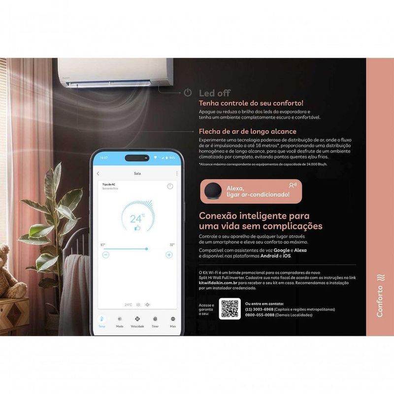 Ar Condicionado Split Hi Wall Full Inverter Daikin 18.000 Btus Quente E Frio 220V R-32Ar Condicionado Split Hi Wall Full Inverter Daikin 18.000 Btus Frio 220v R-32Split Hi Wall Full InverterSilêncio, economia, conforto e conexão inteligente: tudo em um só lugar.Compatível com assistente de voz Google e Alexa. Disponível para Android e IOSTecnologia Japonesa Mais de 100 anos levando ao mundo tecnologias que trazem mais conforto ao dia a dia.A Daikin é uma líder mundial japonesa em ar-condicionado para residências, comércios e indústrias. Desde 2011, está no Brasil com equipe própria, focada em inovação, tecnologia de ponta e qualidade. Nossa missão é levar mais conforto para o dia a dia das pessoas!O conforto que você merece em todas as estações do ano chegou o Full Inverter da Daikin, o ar-condicionado que combina tecnologia e praticidade para manter o clima perfeito em casa o ano todoPor que é tão econômico?Um produto 100% inverter, capaz de garantir a melhor experiência e economia para o seu ambiente.Compressor Inverter: É a tecnologia que controla a velocidade do compressor visando economizar energia e evitar desperdícios.Válvula de expansão eletrônica: Mecanismo que regula com precisão o fluxo de refrigerante no sistema, ajustando-se à demanda para otimizar a eficiência energética e melhorar o desempenho do ar-condicionado em qualquer condição.Ventiladores da condensadora e evaporadora com motores Inverter: Ajusta a rotação do ventilador da evaporadora e condensadora de forma contínua, proporcionando maior eficiência energética, redução de ruído e melhor controle do fluxo de ar para um maior conforto.Seu bolso agradece:Apenas R 0,13 /horaConsumo equivalente ao valor de 1 bala por hora. Economia que gera conforto.Dica de uso: Sabia que configurar seu ar-condicionado entre 23°C e 25°C garante o conforto ideal sem gastar energia desnecessariamente? Ao contrário do que muitos pensam, colocar em 18°C não faz o ambiente gelar mais rápido, apenas aumenta o consumo de energiaPensado em você e para o PlanetaClasse A: 40% mais eficiente que o índice mínimo estabelecido pelo INMETRO para classe A.Produto com fluido R-32Menor potencial de aquecimento global (GWP);Menor carga de refrigerante;Mesmo ferramental de instalação.Mais silencioso que um sussurro!Led Off: Tenha controle do seu conforto!Apague ou reduza o brilho dos leds da evaporadora e tenha um ambiente completamente escuro e confortávelFlecha de ar de longo alcanceExperimente uma tecnologia poderosa de distribuição de ar, onde o fluxo de ar é impulsionado a até 16 metros*, proporcionando uma distribuição homogênea e de longo alcance, para que você desfrute de um ambiente climatizado por completo, evitando pontos quentes e/ou frios.Alexa, ligar ar-condicionado!Conexão inteligente para uma vida sem complicaçõesControle o seu aparelho de qualquer lugar através de um smartphone e eleve seu conforto ao máximo. Compatível com assistentes de voz Google e Alexa e disponível nas plataformas Android e iOS.IMPORTANTE:O Kit Wi-Fi é um brinde promocional para os compradores do novo Split Hi Wall Full Inverter. Cadastre sua nota fiscal de acordo com as instruções no link kitwifidaikin.com.br para receber o seu kit em casa. Recomendamos a instalação por um instalador credenciado.Especificações TécnicasCapacidade de Climatização: 18.000 BTU/hCiclo: Quente e FrioClassificação Inmetro: Classe ATipo Condensadora: Descarga Horizontal (Caixa)Ciclo: Quente e FrioVoltagem: 220VSerpentina: CobreFabricante: DaikinCondensador: HorizontalSmart Wi-Fi: SimCompressor: InverterClassificação INMETRO: ATipo: Hi wallControle de temperatura: SimGarantia do fornecedor: SimFiltro de proteção ativa: SimCor da Evaporadora: BrancoFonte de alimentação: ElétricaDirecionadores de Ar: SimTipo de Conexão: Sem fioMedida Evaporadora (A x L x P) cm: 28,5 x 77 x 22,3Medida Condensadora (A x L x P) cm: 55 x 74 x 32,6Função Timer: SimPainel eletrônico: SimGás Refrigerante: R-32Tipo De Fonte De Alimentação: ElétricaTipo De Ar Condicionado: InverterCódigo Evaporadora: FTHC18T5VLCódigo Condensadora: RHC18T5VLCódigo Modelo: RHC18T5VLCódigo Interno: 48545Volumes de embalagem: 2Garantia: 2 anos no ar-condicionado completo e 10 anos no compressor (Instalando com parceiros credenciados)