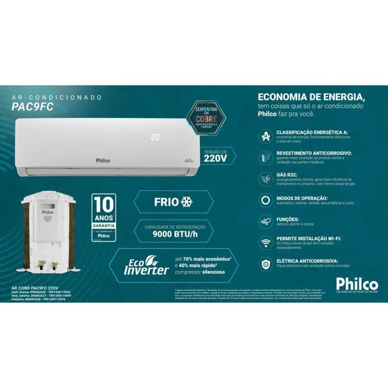 Ar Condicionado Split Philco Hi Wall Inverter 9.000 Btus/h Frio PAC9FC 220V Ar Condicionado Split Philco Hi Wall Inverter 9.000 BTUs/h Frio PAC9FC 220V Invista em conforto, economia de energia e bem-estar com o Ar Condicionado Split Philco Inverter 9.000 BTU/h Frio PAC9FC. Principais Características Classificação Energética A: maior economia de energia. Pintura Anticorrosiva: aletas com pintura que garante mais proteção e vida útil. Gás R32: proporciona maior eficiência energética, reduzindo o consumo. Filtro: lavável e fácil de trocar. Diversas Funções: Dormir, Timer, Oscilar e Turbo. Modos de Operação: Refrigera, Desumidifica, Ventila e Auto. Controle de Ventilação: baixo, médio, alto e automático. Wi-Fi: possibilita instalar o Kit Philco Home Smart Wi-Fi (vendido separadamente). Filtro de ar: antibactéria e antifungos. Compressor rotativo. Painel e filtro de fácil limpeza. Especificações Técnicas Marca: Philco Modelo: PAC9FC Cor: Branco Voltagem: 220V Capacidade de Refrigeração: 9.000 BTU/h Tipo de Tecnologia: Inverter Ciclo de Ar: Frio Gás: R32 Serpentina: Cobre Classe Energética: A Consumo: 376 kWh/ano Frequência: 60 Hz Fase: Monofásico Controle Remoto: Sim Controle de Temperatura Digital: 16°C a 32°C Modo de Operação: Refrigerar, Desumidificar, Ventilar, Aquecer e Automático Funções: Dormir, Oscilar, Timer, Turbo, Silêncio, Display Controle de Ventilação: Alto, Médio, Baixo e Automático Vazão de Ar: 500 m³/h Tubulação para Conexão: 1/4" e 3/8" Nível de Ruído (Unidade Interna): 41 dB Nível de Ruído (Unidade Externa): 57 dB Dimensões e Peso Unidade Interna (Evaporadora): 20,0 x 72,5 x 29,5 cm | Peso: 7 kg Unidade Externa (Condensadora): 53,0 x 72,5 x 27,0 cm | Peso: 18,5 kg Garantia 1 ano para instalação realizada por empresas credenciadas (3 meses de garantia legal + 9 meses contra defeito de fabricação). Observações Certifique-se da montagem correta de todas as partes antes do uso. Produto indicado para uso doméstico. Verifique o prazo de garantia no Manual de Instruções. Em caso de problemas, procure uma assistência técnica autorizada. Conferir o produto no ato da entrega. Em caso de anormalidade, recuse o recebimento. Todas as informações são de responsabilidade do fabricante e podem sofrer alterações sem aviso prévio. Imagem meramente ilustrativa.