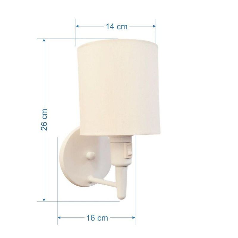 Arandela Cilíndrica Md-2030 Branca Com Liga E Desliga Cúpula Algodão Crú - BivoltArandela de parede Cilíndrica Md-2030 Branca Com Liga e Desliga Cúpula Algodão Crú - BivoltAs arandelas Lustres Vivare são elementos versáteis e elegantes que podem transformar qualquer ambiente em um espaço cheio de estilo. Seja para adicionar uma iluminação suave, destacar uma parede ou criar um efeito de luz diferenciado.Dimensão:Cúpula em Tecido: 14x15cmFormato: CilíndricaTamanho: PequenoEspecificação:Material: Cúpula em Tecido, Estrutura em AlumínioBase Parede: Diâmetro 11x1,2cmResistente: Á MaresiaVoltagem: 110V/220VLiga e Desliga: Interruptor no SoqueteTipo de Soquete: E27Lâmpada Utilizada: Led Bulbo até 16w ou Fluorescente Espiral até 25w CadaCapacidade de Lâmpadas: 1Observação:Acompanha Lâmpada: NãoPossui Led Integrado: NãoGarantia: 12 MesesManual de Instalação: SimArandela de parede Montada: SimControle de Luminosidade: NãoTipo de Embalagem: CaixaConservação e Manutenção do Produto:A Limpeza deve ser realizada com o produto desligado. Remova o lustre que pode ser lavado com sabão neutro. Nunca utilize produtos químicos e abrasivosDica:Antes de comprar o seu produto verifique as medidas, o local onde pretende instalar e se necessário o serviço de um profissional qualificado.