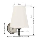 Arandela Cone Md-2007 Base Branco Cúpula Em Tecido 20/08x18cm Branco - BivoltArandela de parede Cone Md-2007 Base Branca Cúpula em Tecido 20/08x18cm BrancoAs arandelas Lustres Vivare são elementos versáteis e elegantes que podem transformar qualquer ambiente em um espaço cheio de estilo. Seja para adicionar uma iluminação suave, destacar uma parede ou criar um efeito de luz diferenciado.Dimensão:Cúpula em Tecido: 20x08x18cmArandela de parede Montada: Altura 23cm Largura 18cm Profundidade 23cmFormato: ConeTamanho: MédioEspecificação:Material: Cúpula em Tecido, Estrutura em AlumínioBase Parede: Diâmetro 11x1,2cmResistente: Á MaresiaVoltagem: 110V/220VLiga e Desliga: Interruptor no SoqueteTipo de Soquete: E27Tipo de Lâmpada: Led Bulbo Até 16w ou Fluorescente Espiral Até 25w CadaCapacidade de Lâmpadas: 1Observação:Acompanha Lâmpada: NãoPossui Led Integrado: NãoGarantia: 12 MesesManual de Instalação: SimArandela de parede Montada: SimControle de Luminosidade: NãoTipo de Embalagem: CaixaConservação e Manutenção do Produto:A Limpeza deve ser realizada com o produto desligado. Remova o lustre que pode ser lavado com sabão neutro. Nunca utilize produtos químicos e abrasivosAntes de comprar o seu produto verifique as medidas, o local onde pretende instalar e se necessário o serviço de um profissional qualificado.