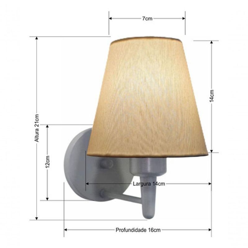 Arandela Parede Vivare Md-2004 Cinza Cúpula Em Tecido - Bivolt Cinza-algodão-crú 127/220vArandela Parede Vivare Md-2004 Cinza Cúpula em Tecido - BivoltAs arandelas Lustres Vivare são elementos versáteis e elegantes que podem transformar qualquer ambiente em um espaço cheio de estilo. Seja para adicionar uma iluminação suave, destacar uma parede de quarto ou sala e criar um efeito de luz diferenciado.Dimensão:Cúpula em Tecido: 14x7x14cmArandela de parede Montada: Altura 21cm Largura 14cm Profundidade 16cmFormato: ConeTamanho: PequenoEspecificação:Material: Cúpula em TecidoEstrutura em AlumínioBase Parede: Diâmetro 11x1,2cmResistente: Á MaresiaVoltagem: 110V/220VLiga e Desliga: NãoTipo de Soquete: E27Lâmpada Utilizada: Led Bulbo Até 16w ou Fluorescente Espiral Até 25w CadaCapacidade de Lâmpadas: 1Observação:Acompanha Lâmpada: NãoPossui Led Integrado: NãoGarantia: 12 MesesManual de Instalação: SimArandela de parede Montada: SimControle de Luminosidade: NãoTipo de Embalagem: CaixaConservação e Manutenção do Produto:A Limpeza deve ser realizada com o produto desligado. Remova o lustre que pode ser lavado com sabão neutro. Nunca utilize produtos químicos e abrasivosDica:Antes de comprar o seu produto verifique as medidas, o local onde pretende instalar e se necessário o serviço de um profissional qualificado.