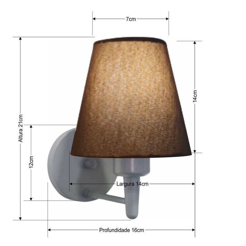Arandela Parede Vivare Md-2004 Cinza Cúpula Em Tecido - Bivolt Cinza-caqui 127/220vArandela Parede Vivare Md-2004 Cinza Cúpula em Tecido - BivoltAs arandelas Lustres Vivare são elementos versáteis e elegantes que podem transformar qualquer ambiente em um espaço cheio de estilo. Seja para adicionar uma iluminação suave, destacar uma parede de quarto ou sala e criar um efeito de luz diferenciado.Dimensão:Cúpula em Tecido: 14x7x14cmArandela de parede Montada: Altura 21cm Largura 14cm Profundidade 16cmFormato: ConeTamanho: PequenoEspecificação:Material: Cúpula em TecidoEstrutura em AlumínioBase Parede: Diâmetro 11x1,2cmResistente: Á MaresiaVoltagem: 110V/220VLiga e Desliga: NãoTipo de Soquete: E27Lâmpada Utilizada: Led Bulbo Até 16w ou Fluorescente Espiral Até 25w CadaCapacidade de Lâmpadas: 1Observação:Acompanha Lâmpada: NãoPossui Led Integrado: NãoGarantia: 12 MesesManual de Instalação: SimArandela de parede Montada: SimControle de Luminosidade: NãoTipo de Embalagem: CaixaConservação e Manutenção do Produto:A Limpeza deve ser realizada com o produto desligado. Remova o lustre que pode ser lavado com sabão neutro. Nunca utilize produtos químicos e abrasivosDica:Antes de comprar o seu produto verifique as medidas, o local onde pretende instalar e se necessário o serviço de um profissional qualificado.