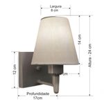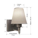Arandela Quadrada Md-2034 Cinza Cúpula Em Tecido Cone Branca - BivoltArandela de parede Quadrada Md-2034 Cinza Cúpula em Tecido Cone Branca - BivoltAs arandelas Lustres Vivare são elementos versáteis e elegantes que podem transformar qualquer ambiente em um espaço cheio de estilo. Seja para adicionar uma iluminação suave, destacar uma parede ou criar um efeito de luz diferenciado.Dimensão:Cúpula em Tecido: 14x07x14cmArandela de parede Montada: Altura 24cm Largura 14cm Profundidade 17cmFormato: Quadrado / ConeTamanho: PequenoEspecificação:Material: Cúpula em TecidoEstrutura em AlumínioBase Parede: Quadrado 12x12x2cmResistente: Á MaresiaVoltagem: 110V/220VLiga e Desliga: NãoTipo de Soquete: E27Lâmpada Utilizada: Led Bulbo Até 16w ou Fluorescente Espiral Até 25w cadaCapacidade de Lâmpadas: 1Observação:Acompanha Lâmpada: NãoPossui Led Integrado: NãoGarantia: 12 MesesManual de Instalação: SimArandela de parede Montada: SimControle de Luminosidade: NãoTipo de Embalagem: CaixaConservação e Manutenção do Produto:A Limpeza deve ser realizada com o produto desligado. Remova o lustre que pode ser lavado com sabão neutro. Nunca utilize produtos químicos e abrasivosDica:Antes de comprar o seu produto verifique as medidas, o local onde pretende instalar e se necessário o serviço de um profissional qualificado.