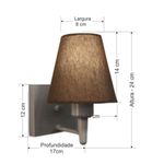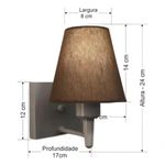 Arandela Quadrada Md-2034 Cinza Cúpula Em Tecido Cone Café - BivoltArandela de parede Quadrada Md-2034 Cinza Cúpula em Tecido Cone Café - BivoltAs arandelas Lustres Vivare são elementos versáteis e elegantes que podem transformar qualquer ambiente em um espaço cheio de estilo. Seja para adicionar uma iluminação suave, destacar uma parede ou criar um efeito de luz diferenciado.Dimensão:Cúpula em Tecido: 14x07x14cmArandela de parede Montada: Altura 24cm Largura 14cm Profundidade 17cmFormato: Quadrado / ConeTamanho: PequenoEspecificação:Material: Cúpula em TecidoEstrutura em AlumínioBase Parede: Quadrado 12x12x2cmResistente: Á MaresiaVoltagem: 110V/220VLiga e Desliga: NãoTipo de Soquete: E27Lâmpada Utilizada: Led Bulbo Até 16w ou Fluorescente Espiral Até 25w cadaCapacidade de Lâmpadas: 1Observação:Acompanha Lâmpada: NãoPossui Led Integrado: NãoGarantia: 12 MesesManual de Instalação: SimArandela de parede Montada: SimControle de Luminosidade: NãoTipo de Embalagem: CaixaConservação e Manutenção do Produto:A Limpeza deve ser realizada com o produto desligado. Remova o lustre que pode ser lavado com sabão neutro. Nunca utilize produtos químicos e abrasivosDica:Antes de comprar o seu produto verifique as medidas, o local onde pretende instalar e se necessário o serviço de um profissional qualificado.