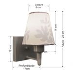 Arandela Quadrada Md-2034 Cinza Cúpula Em Tecido Cone Renda Branca - BivoltArandela de parede Quadrada Md-2034 Cinza Cúpula em Tecido Cone Renda Branca - BivoltAs arandelas Lustres Vivare são elementos versáteis e elegantes que podem transformar qualquer ambiente em um espaço cheio de estilo. Seja para adicionar uma iluminação suave, destacar uma parede ou criar um efeito de luz diferenciado.Dimensão:Cúpula em Tecido: 14x07x14cmArandela de parede Montada: Altura 24cm Largura 14cm Profundidade 17cmFormato: Quadrado / ConeTamanho: PequenoEspecificação:Material: Cúpula em TecidoEstrutura em AlumínioBase Parede: Quadrado 12x12x2cmResistente: Á MaresiaVoltagem: 110V/220VLiga e Desliga: NãoTipo de Soquete: E27Lâmpada Utilizada: Led Bulbo Até 16w ou Fluorescente Espiral Até 25w cadaCapacidade de Lâmpadas: 1Observação:Acompanha Lâmpada: NãoPossui Led Integrado: NãoGarantia: 12 MesesManual de Instalação: SimArandela de parede Montada: SimControle de Luminosidade: NãoTipo de Embalagem: CaixaConservação e Manutenção do Produto:A Limpeza deve ser realizada com o produto desligado. Remova o lustre que pode ser lavado com sabão neutro. Nunca utilize produtos químicos e abrasivosDica:Antes de comprar o seu produto verifique as medidas, o local onde pretende instalar e se necessário o serviço de um profissional qualificado.