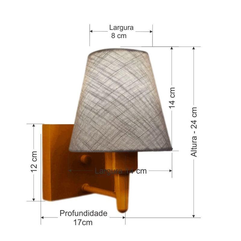 Arandela Quadrada Md-2034 Cobre Cúpula Em Tecido Cone Rustico Cinza - BivoltArandela de parede Quadrada Md-2034 Cobre Cúpula em Tecido Cone Rustico Cinza - BivoltAs arandelas Lustres Vivare são elementos versáteis e elegantes que podem transformar qualquer ambiente em um espaço cheio de estilo. Seja para adicionar uma iluminação suave, destacar uma parede ou criar um efeito de luz diferenciado.Dimensão:Cúpula em Tecido: 14x07x14cmArandela de parede Montada: Altura 24cm Largura 14cm Profundidade 17cmFormato: Quadrado / ConeTamanho: PequenoEspecificação:Material: Cúpula em TecidoEstrutura em AlumínioBase Parede: Quadrado 12x12x2cmResistente: Á MaresiaVoltagem: 110V/220VLiga e Desliga: NãoTipo de Soquete: E27Lâmpada Utilizada: Led Bulbo Até 16w ou Fluorescente Espiral Até 25w cadaCapacidade de Lâmpadas: 1Observação:Acompanha Lâmpada: NãoPossui Led Integrado: NãoGarantia: 12 MesesManual de Instalação: SimArandela de parede Montada: SimControle de Luminosidade: NãoTipo de Embalagem: CaixaConservação e Manutenção do Produto:A Limpeza deve ser realizada com o produto desligado. Remova o lustre que pode ser lavado com sabão neutro. Nunca utilize produtos químicos e abrasivosDica:Antes de comprar o seu produto verifique as medidas, o local onde pretende instalar e se necessário o serviço de um profissional qualificado.