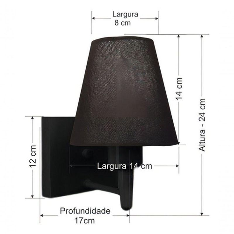 Arandela Quadrada Md-2034 Preto Cúpula Em Tecido Cone Preta - BivoltArandela de parede Quadrada Md-2034 Preto Cúpula em Tecido Cone Preta - BivoltAs arandelas Lustres Vivare são elementos versáteis e elegantes que podem transformar qualquer ambiente em um espaço cheio de estilo. Seja para adicionar uma iluminação suave, destacar uma parede ou criar um efeito de luz diferenciado.Dimensão:Cúpula em Tecido: 14x07x14cmArandela de parede Montada: Altura 24cm Largura 14cm Profundidade 17cmFormato: Quadrado / ConeTamanho: PequenoEspecificação:Material: Cúpula em TecidoEstrutura em AlumínioBase Parede: Quadrado 12x12x2cmResistente: Á MaresiaVoltagem: 110V/220VLiga e Desliga: NãoTipo de Soquete: E27Lâmpada Utilizada: Led Bulbo Até 16w ou Fluorescente Espiral Até 25w cadaCapacidade de Lâmpadas: 1Observação:Acompanha Lâmpada: NãoPossui Led Integrado: NãoGarantia: 12 MesesManual de Instalação: SimArandela de parede Montada: SimControle de Luminosidade: NãoTipo de Embalagem: CaixaConservação e Manutenção do Produto:A Limpeza deve ser realizada com o produto desligado. Remova o lustre que pode ser lavado com sabão neutro. Nunca utilize produtos químicos e abrasivosDica:Antes de comprar o seu produto verifique as medidas, o local onde pretende instalar e se necessário o serviço de um profissional qualificado.