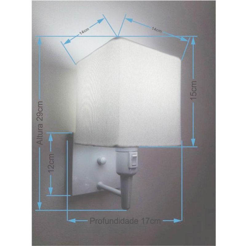 Arandela Quadrada Vivare Md-2019 Base Branco Com Interruptor Cúpula Em Tecido - Bivolt Branco-branco 127/220vArandela de parede Quadrada Vivare Md-2019 Base Branca Com Interruptor Cúpula TecidoAs arandelas Lustres Vivare são elementos versáteis e elegantes que podem transformar qualquer ambiente em um espaço cheio de estilo. Seja para adicionar uma iluminação suave, destacar uma parede ou criar um efeito de luz diferenciado.Dimensão:Cúpula em Tecido: 15x14x14cmArandela de parede Montada: Altura 29cm Largura 14cm Profundidade 17cmFormato: QuadradoTamanho: PequenoEspecificação:Material: Cúpula em TecidoEstrutura em AlumínioBase Parede: Quadrado 12x12x2cmResistente: Á MaresiaVoltagem: 110V/220VLiga e Desliga: Interruptor no SoqueteTipo de Soquete: E27Lâmpada Utilizada: Led Bulbo Até 16w ou Fluorescente Espiral Até 25w CadaCapacidade de Lâmpadas: 1Observação:Acompanha Lâmpada: NãoPossui Led Integrado: NãoGarantia: 12 MesesManual de Instalação: SimArandela de parede Montada: SimControle de Luminosidade: NãoTipo de Embalagem: CaixaConservação e Manutenção do Produto:A Limpeza deve ser realizada com o produto desligado. Remova o lustre que pode ser lavado com sabão neutro. Nunca utilize produtos químicos e abrasivosDica:Antes de comprar o seu produto verifique as medidas, o local onde pretende instalar e se necessário o serviço de um profissional qualificado.