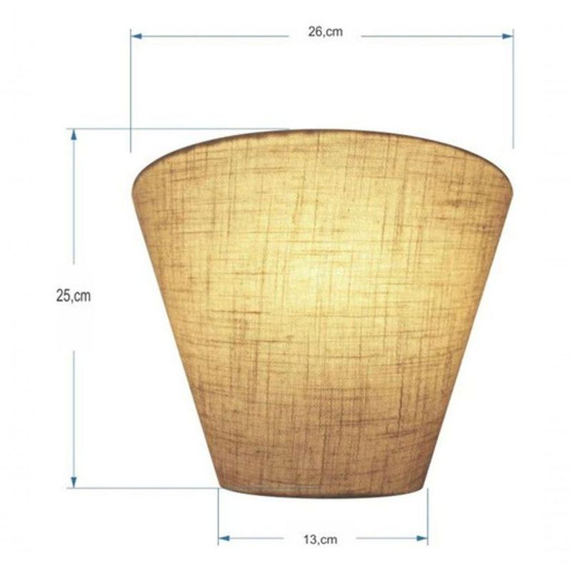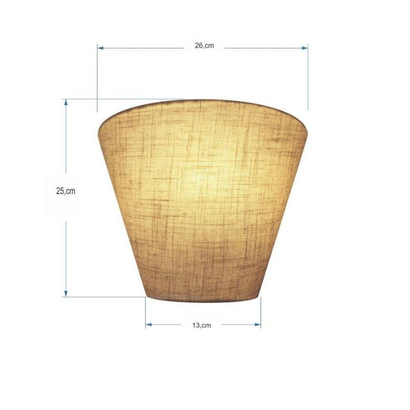 Arandela Retro Cone Md-2001 Cúpula Em Tecido 25/26x13cm Rustico Bege - BivoltArandela de parede Retro Cone Md-2001 Cúpula Tecido 25/26x13cm Rustico BegeAs arandelas Lustres Vivare são elementos versáteis e elegantes que podem transformar qualquer ambiente em um espaço cheio de estilo. Seja para adicionar uma iluminação suave, destacar uma parede ou criar um efeito de luz diferenciado.Dimensão:Cúpula em Tecido: 25x26x13cmFormato: ConeTamanho: MédioEspecificação:Cúpula em TecidoEstrutura em AlumínioBase Parede: Diâmetro 11x1,2cmResistente: Á MaresiaVoltagem: 110V/220VLiga e Desliga: NãoTipo de Soquete: E27Lâmpada Utilizada: Led Bulbo Até 16w ou Fluorescente Espiral Até 25w cadaCapacidade de Lâmpadas: 1Observação:Acompanha Lâmpada: NãoPossui Led Integrado: NãoGarantia: 12 MesesManual de Instalação: SimArandela de parede Montada: SimControle de Luminosidade: NãoTipo de Embalagem: CaixaConservação e Manutenção do Produto:A Limpeza deve ser realizada com o produto desligado. Remova o lustre que pode ser lavado com sabão neutro. Nunca utilize produtos químicos e abrasivosDica:Antes de comprar o seu produto verifique as medidas, o local onde pretende instalar e se necessário o serviço de um profissional qualificado.