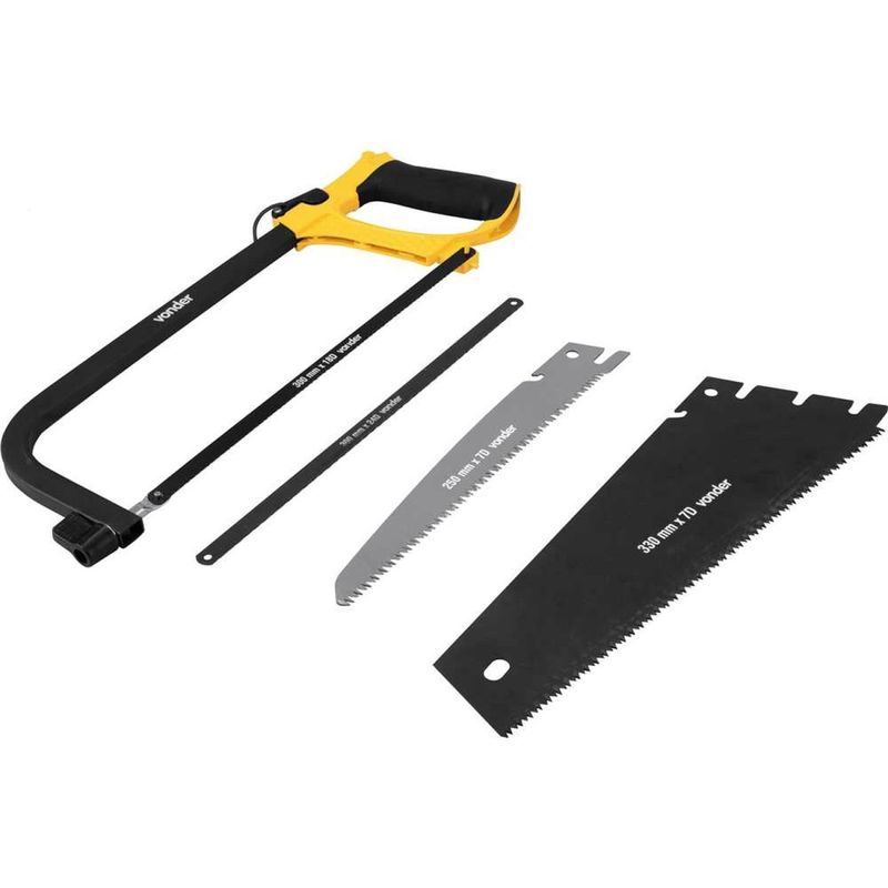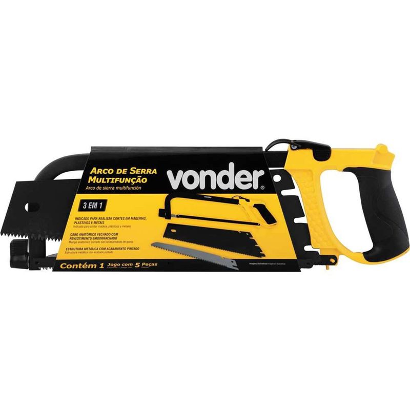 Arco de Serra Multifunção, 3 em 1, Vonder - Conteúdo da embalagem: 1 Arco de serra. Acompanha: 1 lâmina serrote para madeira, 1 lâmina serrote para poda, 1 lâmina serrote bimetálica para metal e 1 lâmina serrote de aço para plástico. Aplicação: Indicado para realizar cortes em madeiras, plásticos e metais. Destaques: Possui cabo anatômico fechado com revestimento emborrachado, fornecendo maior conforto ao usuário. Estrutura metálica com acabamento pintado, proporcionando maior proteção contra oxidação/corrosão. Conta com sistema multifunção, permitindo a utilização em diversos trabalhos. Referência: 3565300100 Garantia - E (CDC): Garantia legal: 90 dias Medida da lâmina do arco de serra: 12" - 300 mm Tipo de cabo: Fechado Material da estrutura do arco de serra: Metálico Material do cabo: Metálico, com revestimento emborrachado Tipo de ajuste do arco de serra: Regulável Massa aproximada (peso): 0,76 kg Destaques Comercial: Cabo anatômico emborrachado e estrutura metálica pintada para proteção; sistema multifunção. Aplicação Comercial: Indicado para cortes em madeiras, plásticos e metais. Características Gerais do Produto: Garantia: • 3 Meses
