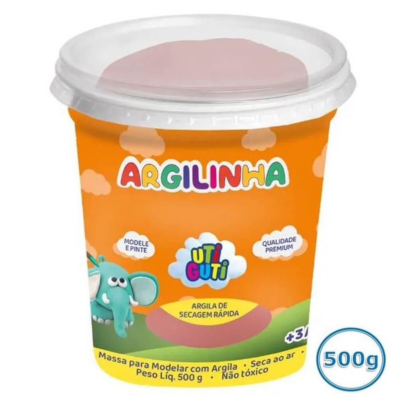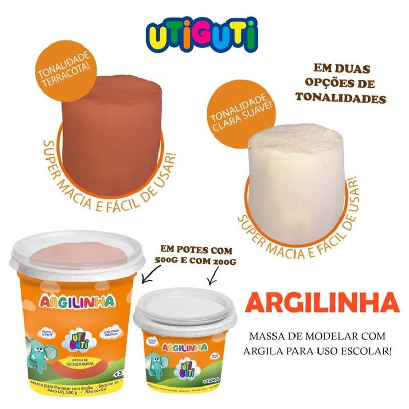 Argilinha Uti Guti Massa de Modelar com Argila 500g Terracota - Uti Guti Desenvolvida para atividades lúdicas esta massa de modelar possui Argila Mineral purificada combinada com aglutinantes minerais ou vegetais, estimula o desenvolvimento da coordenação motora e a percepção de formas e texturas variadas, além de incentivar o aprendizado e auxiliar no processo de criatividade das crianças. Enquanto manuseiam a massinha, os pequenos deixam a imaginação fluir e conseguem criar diversas modelagens, o produto é ideal para atividades escolares. Detalhes: - Pote com 500 gramas - Cor: Terracota - Modele e pinte - Macia e levemente aromatizada - Fácil de manusear por crianças e adultos - Qualidade Premium - Secagem rápida (não deixe secar em moldes) - Pode ser lixada e pintada com tintas solúveis em água, esmaltes, óleos vernizes e canetas hidrográficas - Recomendado para crianças a partir de 03 anos de idade. - Composição: água, resina, carboidrato de cereais, hidrocarbonetos alifáticos e conservantes. Embalagem com 01 unidadeImagens meramente ilustrativas, as cores podem variar em cada tela ou monitor.