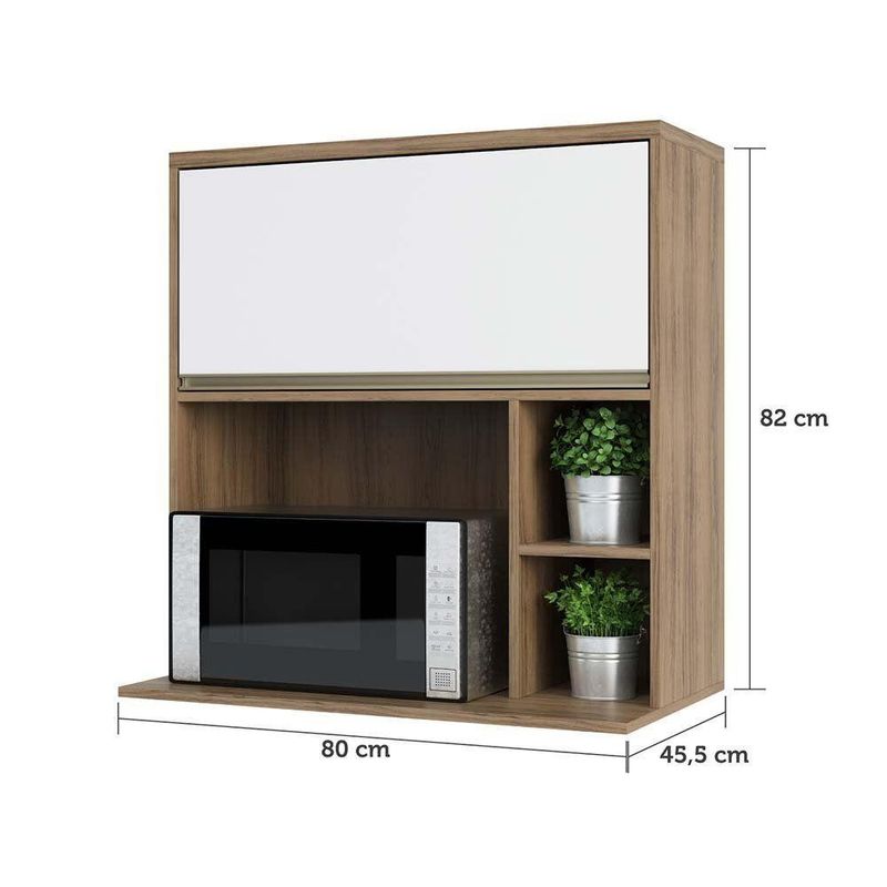 Armario Aereo 80 cm 1 Porta Basculante Nicho Micro Conjugado e Nicho Lateral Mel Luciane Moveis. O Armario Aereo com 80 cm Mel foi desenvolvido aliando beleza e praticidade ao seu ambiente. Conta com 1 porta basculante com pistao a gas 80N, nicho para micro e nicho lateral, puxador em aluminio gola na cor Inox. Acompanha sistema para fixacao na parede.Caracteristicas: Corpo/Caixaria: MDP Vanilla UV Touch Dobradicas: Metalicas Ø26mm Pistao a gas 80N Puxadores: Aluminio Gola - Inox Portas: 1 Nicho: Sim - Microondas e lateral Dimensoes do produto Altura: 82 cm Largura: 80 cm Profundidade: 42 cm Peso: 19,9 kg Garantia de 3 meses direto do fabricante. Informacoes complementares: Fique de olho: siga sempre as orientacoes do fabricante e utilize seu produto de acordo com o manual. A empresa nao se responsabiliza pelo mau uso do produto, o que pode causar perda da garantia.#8239; Certifique se que seus dados estejam atualizados, como endereco e um telefone valido. A entrega sera realizada no terreo, sendo assim em predios o deslocamento da mercadoria, subir escadas, elevadores ou transporte por guincho para apartamentos fica sob responsabilidade do comprador. Todas as nossas entregas sao realizadas em horario comercial, nao sendo possivel fazer agendamento, sugerimos acompanhar o rastreio do pedido e ter alguem para receber no endereco indicado. Nao nos encarregamos por montagens, desmontagens e outras instalacoes, serao de responsabilidade do comprador.