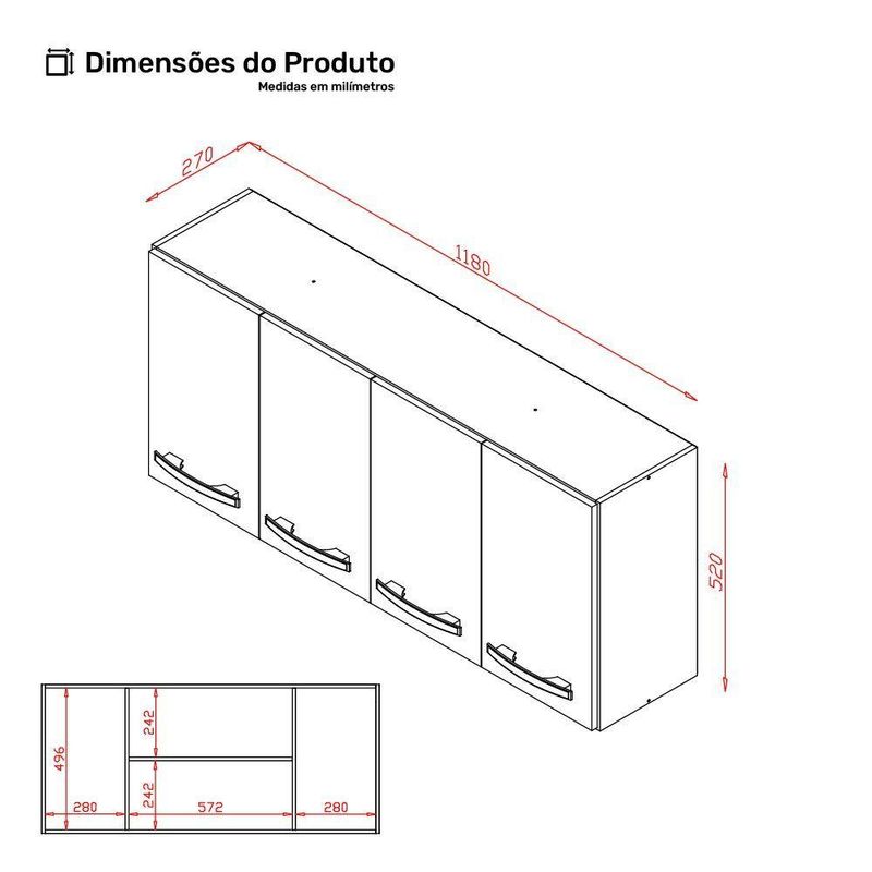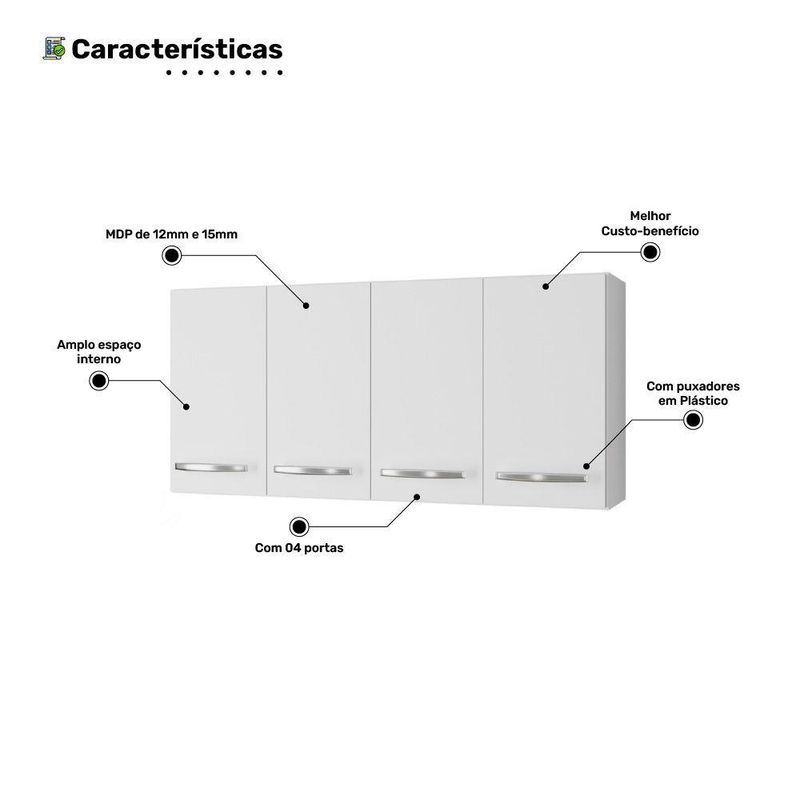 Armário Aéreo Cozinha Marah 118cm 04 Portas Branco - AbmazaTransforme sua cozinha com mais praticidade e elegância!O Armário Aéreo Cozinha Marah foi projetado para quem busca um ambiente organizado e funcional, sem abrir mão do design clássico. Com 04 portas e amplo espaço interno, ele acomoda utensílios, louças e mantimentos de forma prática e acessível. Seu acabamento em pintura garante maior durabilidade e beleza por mais tempo.Por que escolher esse armário?- Espaço otimizado: Perfeito para armazenar tudo o que precisa, mantendo sua cozinha sempre organizada.- Qualidade e resistência: Produzido em MDP com espessuras de 12mm e 15mm, oferecendo mais estabilidade e .- Versatilidade: Ideal para diferentes ambientes, como cozinha, sala de jantar e área gourmet.Aproveite agora para renovar sua cozinha com um móvel que une funcionalidade e sofisticação. Garanta já o seu antes que acabe!Dimensões do Produto Montado:Largura: 118 cmAltura: 52 cmProfundidade: 27 cmPeso Aproximado: 20 kgCaracterísticas:Material da Estrutura: MDP de 12mm e 15mmPeso Suportado: 30 kg distribuídosAcabamento: Pintura Escala de Brilho: BrilhantePossui Portas: SimQuantidade de Portas: 4 portasMaterial das Portas: MDPTipo de Porta: De baterTipo de Puxador: AlçaMaterial do Puxador: PlásticoPossui Prateleiras: SimQuantidade de prateleiras: 1 PrateleiraMaterial da Prateleira: MDPTipo de Produto: Armário de Cozinha, Multiuso, Aéreo de ParedeAmbiente Principal: Cozinha, Área de , Área GourmetSistema de Montagem: Parafusos, Cavilhas e outrosPossui Manual de Montagem: SimDiferenciais:- Acabamento Pintura - Estrutura em MDP- Amplo Espaço InternoItens Inclusos:- 1 Armário Aéreo, manual e acessórios de montagem.Montagem:- Complexidade da Montagem: Médio.- Recomendamos que seja feita por um qualificado.- Produto enviado desmontado.Limpeza e cuidados: Utilizar pano levemente umedecido com água, seguido de pano seco. Não utilizar produtos químicos ou abrasivos na limpeza. Evitar com objetos cortantes. Manter ao abrigo de interno, sem ficar exposto diretamente ao sol, calor e umidade excessivo.Garantia de :90 dias contra de fabricação.Importante:- Pode haver ligeira diferença de tonalidade entre a imagem digital e o produto real por conta do tratamento de imagens e a calibração de cores do seu monitor.- As imagens são meramente ilustrativas, não acompanham objetos de decoração e eletrônicos.- Produto para uso residencial em ambiente interno, não devendo ficar exposto diretamente ao sol, calor e umidades excessivas.- Ao receber a mercadoria verifique a condição da embalagem, caso apresente violação ou esteja danificada não assine o de .- Montagem, desmontagem e outras instalações é de inteira responsabilidade do cliente.- Caso resida em apartamento ou condomínio é indispensável que confira as dimensões do produto e certifique-se de que passará normalmente por elevadores, portas, escadas e/ou corredores de sua residência. Não nos responsabilizamos no ato da , por subir escadas/elevadores ou pelo por guincho em apartamentos. Eventuais despesas são de responsabilidade do comprador.