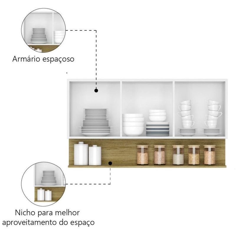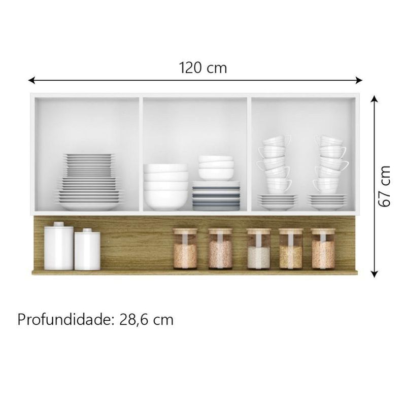 O Armário de Cozinha Aéreo Line possui design versátil e multifuncional, podendo ser utilizado de diversas maneiras, como área gourmet, lavanderia e cozinha. O armário tem 3 portas com dobradiças metálicas, nicho inferior com excelente espaço para copos, xicaras pratos e demais utensílios domésticos. Deixando seu ambiente ainda mais moderno e organizado!MODELO: Armário Aéreo de Cozinha 3 Portas com Nicho 1,20m Freijó / Branco Line Kits ParanáMARCA: Kits ParanáCOR: Freijó / BrancoACABAMENTO: Pintura UVMEDIDA TOTAL DO PRODUTO: [ A ] = 67 cm [ L ] = 120 cm[ P ] = 28,6 cm MATERIAL DA ESTRUTURA: MDPESPESSURA DO MATERIAL DA ESTRUTURA: 15mmQUANTIDADE DE PORTAS: 3TIPO DE PORTA: BaterQUANTIDADE DE PRATELEIRAS: 1PRATELEIRAS SUPORTAM ATÉ: 5kgPOSSUI NICHO: SimMATERIAL DE DOBRADIÇA: MetalARMÁRIO SUPORTA ATÉ: 20kg PESO BRUTO: 21,25kgGARANTIA: 3 Meses ITENS INCLUSOS: Manual de Montagem, Armário AéreoINSTRUÇÕES E CUIDADOS: A limpeza do móvel deve ser efetuada somente com pano macio e moderadamente umedecido com água ou solução com sabão neutro. evitar mover o produto com utensílios dentro do mesmo. atentar para as especificações no esquema de montagem, sobre o peso suportado pelo produto.AVISO: Montagem não inclusa! Entregamos até a porta de entrada da casa do cliente ou até a portaria do condomínio. Foto ilustrativa. A percepção das cores pode ser um pouco diferente da mostrada na foto do anúncio em função da luminosidade do ambiente. MODELO:: Armário Aéreo de Cozinha 3 Portas com Nicho 1,20m Freijó / Branco Line Kits Paraná | MARCA: Kits Paraná | COR:: Freijó / Branco | ACABAMENTO:: Pintura UV | MEDIDA TOTAL DO PRODUTO:: [ A ] = 67 cm [ L ] = 120 cm [ P ] = 28,6 cm | MATERIAL DA ESTRUTURA:: MDP | ESPESSURA DO MATERIAL DA ESTRUTURA:: 15mm | QUANTIDADE DE PORTAS:: 3 | TIPO DE PORTA:: Bater | QUANTIDADE DE PRATELEIRAS:: 1 | PRATELEIRAS SUPORTAM ATÉ:: 5 kg | POSSUI NICHO:: Sim | MATERIAL DE DOBRADIÇA:: Metal | ARMÁRIO SUPORTA ATÉ:: 20 kg | PESO BRUTO:: 21,25 kg | GARANTIA:: 3 Meses | ITENS INCLUSOS:: Manual de Montagem, Armário Aéreo | INSTRUÇÕES E CUIDADOS:: A limpeza do móvel deve ser efetuada somente com pano macio e moderadamente umedecido com água ou solução com sabão neutro. evitar mover o produto com utensílios dentro do mesmo. atentar para as especificações no esquema de montagem, sobre o peso suportad | AVISO:: Montagem não inclusa! Entregamos até a porta de entrada da casa do cliente ou até a portaria do condomínio. Foto ilustrativa. A percepção das cores pode ser um pouco diferente da mostrada na foto do anúncio em função da luminosidade do ambiente. Cor: frej/branc