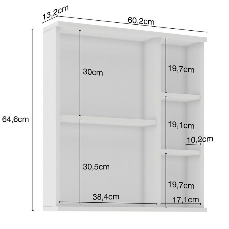 Combinar rotina, organização e elegância nem sempre é fácil, conseguir manter os ambientes limpos e em ordem é primordial para que nossas atividades sigam de maneira serena. O Conjunto Para Banheiro Gabinete 01 Gaveta Com Cuba E Armário Aéreo Bia B06 Branco - Lyam Decor vem com design clean, otimiza seu espaço auxiliando muito bem no armazenamento de seus itens e garante praticidade no dia-dia. É produzido com excelentes materiais e acabamento impecável, também o espelho com tamanho ideal, cabe mencionar ainda as dobradiças da porta que possuem sistema Slow-Motion, esta tecnologia permite fechamento silencioso e sem impacto, proporcionando maior durabilidade ao produto. Pode ser disposto em banheiro, lavabo ou outro cômodo de sua preferência. Aproveite! Dimensões do Produto (A x L x P) 64,6 x 60,2 x 13,2 cm Medidas Internas: Altura das prateleiras: 30 e 19,1 cmLargura das prateleiras: 38,4 e 17,1 cmProfundidade das prateleiras: 10,2 cm Características do Poduto: Estrutura 100% em MDF. 01 Porta de bater, dobradiças de aço com sistema de amortecimento Slow-Motion (Fechamento silencioso com freio anti-impacto). 01 Espelho lapidado com 3mm sobre painel MDF de 15mm. 03 Nichos e 01 prateleira interna. Produto na cor Branco. Suporta até 15kg por prateleira. - Acompanha suportes para instalação na parede. - Produto entregue desmontado, acompanha manual de montagem. - A limpeza deve ser feita com pano macio seco, não utilizar produtos abrasivos, desengordurantes, álcool ou solvente. Observações importantes: - Produto para uso residencial em ambiente interno, não devendo ficar exposto diretamente ao sol, calor e umidade excessivos. - Pode haver alguma diferença de tonalidade entre a imagem e o produto real, por conta do tratamento de imagens e a calibração de cores do seu monitor. - As imagens são meramente ilustrativas, não acompanham objetos de decoração e eletrônicos. - Ao receber a mercadoria, o cliente deve verificar as condições da embalagem, caso haja alguma avaria não assine o comprovante de recebimento. - Montagem, desmontagem e outras instalações serão de responsabilidade do cliente. Não nos responsabilizamos, no ato da entrega, por subir escadas/elevadores ou pelo transporte por guincho em apartamentos. Eventuais despesas são de responsabilidade do comprador. - Confira as dimensões do produto e certifique-se de que passará normalmente por supostos elevadores, portas, escadas e/ou corredores de sua residência.