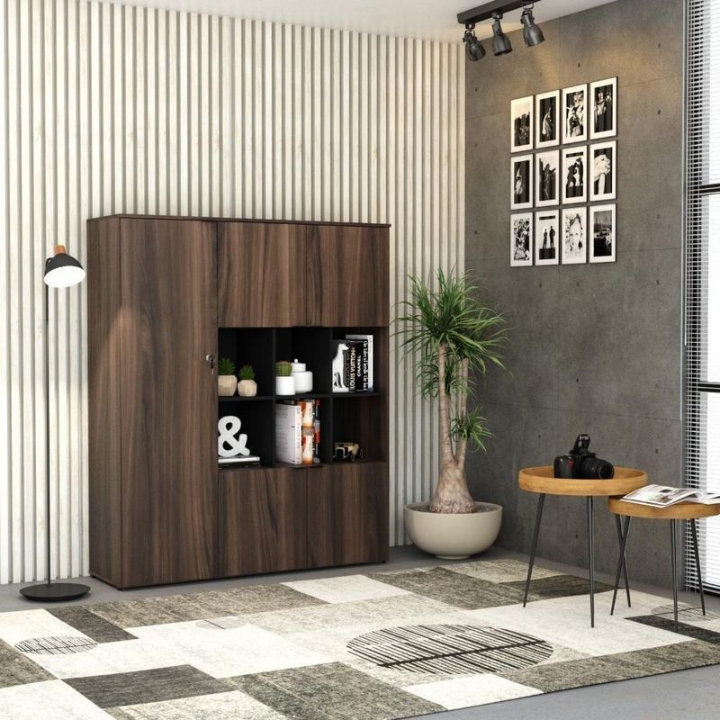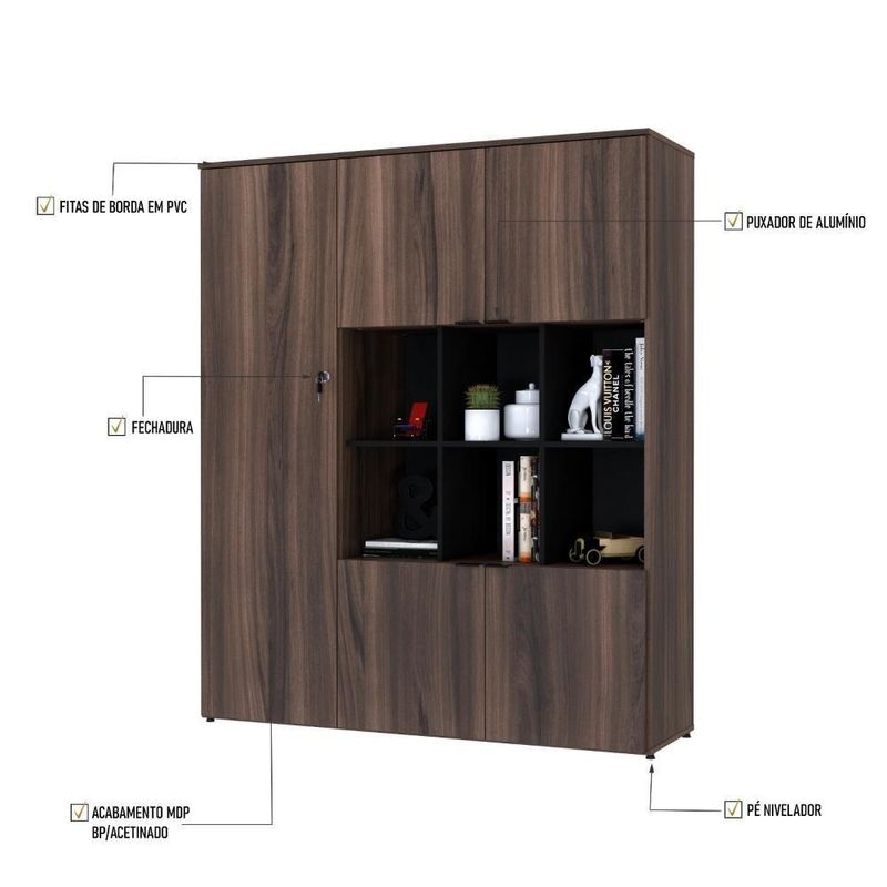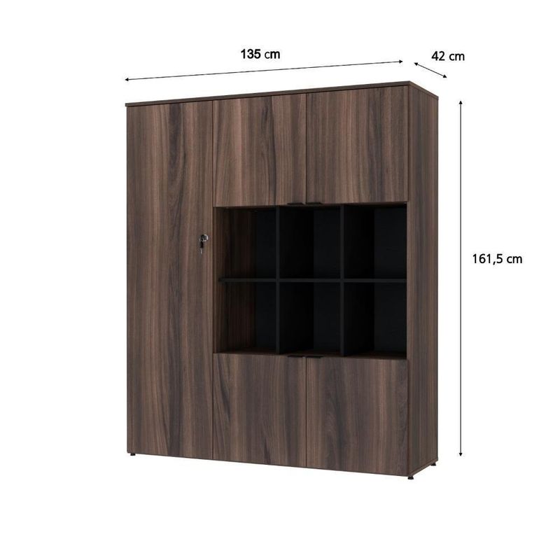 Armário Alto C/nichos E 05 Portas 161,5x135x42cm Wlan135 Nogal / Preto Nogal / PretoSobre o ProdutoArmário Alto C/Nichos e 05 Portas 161,5x135x42cm WLAN135 Carvalho / BrancoDescrição do Produto:Armário Alto com Nichos WLAN135 WorkLab é uma peça de mobiliário que alia capacidade de armazenamento com um design elegante e moderno, ideal para escritórios que valorizam tanto a funcionalidade quanto a estética. Com nichos centrais abertos e cinco portas, este armário oferece uma solução de armazenamento diversificada, perfeita para exibir itens decorativos ou manter materiais de consulta rápida à mão. Suas portas possuem dobradiças com amortecedor que garantem um fechamento suave e silencioso, além dos puxadores em alumínio, elegantes e funcionais. O Armário WLAN135 WorkLab é mais que um simples móvel de armazenamento, é uma declaração de estilo que traz organização e sofisticação ao ambiente de linha WorkLab combina funcionalidade, design contemporâneo e durabilidade para criar um ambiente de trabalho eficiente e inspirador. Com uma ampla variedade de peças versáteis, a WorkLab oferece soluções completas para escritórios, home offices e espaços corporativos. Explore os principais componentes dessa linha e ache a escolha certa para quem busca qualidade, design e funcionalidade em móveis de escritório. Transforme seu espaço de trabalho com a elegância e praticidade da linha Inclusos:1 Armário c/NichoDimensões dos Produtos:Armário Alto C/Nichos e 05 Portas 161,5x135x42cm WLAN135 Carvalho / Branco: 135 x 42 x 161,5 cmInformações Logísticas (Comp. X Prof. X Alt.) 163 x 51 x 7,7 cm - Peso: 31,71 139 x 48 x 12,7 cm - Peso: 40,194 KgPeso Total: 71,904 KgObservações:Não acompanha acessórios decorativos. Imagens meramente ilustrativas.Informações Técnicas / Características:- Cor do Produto: Carvalho / Branco- Cor do Predominante: Marrom Claro- Marca: Compace- Modelo: WLAN135- Linha: WorkLab- Material: Mdp - Acabamento: Perffect Acetinado- Escala de Brilho: Fosco- Fita de Borda: Pvc- Possui Portas: 5- Tipo de Porta: Bater- Tipo da Dobradiça: Metálica C/Amortecedor- Possui Gavetas: Não - Possui Chave: Sim - Material do Puxador: Alumínio- Possui Prateleiras: 5- Peso Máximo por Prateleira: 10kg - Pés Niveladores: Sim - Acabamento Estrutura: BP- Formato: Retangular- Possui Nicho: 6 - Suporta Até (kg): 90kg- Comprimento: 135cm- Profundidade: 42cm- Altura: 161,5cm - Peso Lí.: 70,29Kg- Recomendações de Uso, Manutenção e Limpeza: Para a limpeza, utilize flanela seca ou pano macio levemente umedecido em água. Utilize um pano seco em seguida. Evite com produtos químicos (solventes, thinner, acetona, etc) e não utilize nenhum tipo de esponja de aço.- Necessita de Montagem: Sim / Acompanha Manual de Montagem- Complexidade da Montagem: Alta: deve ser montado por um montador especializado.- Garantia: 6 meses Comprimento: 135 | Largura: 42 | Marca: Compace | Altura: 161,5 | Necessita montagem: Sim | Modelo: WLAN135 | Quantidade máxima de pedido: 1 | Quantidade de volumes: 2 | Profundidade: 42 Cor: Nogal / Preto