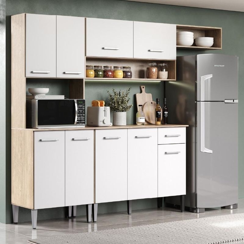Armário Cozinha Compacta Arizona Smart Carraro - Carvalho/branco Carvalho/brancoA Cozinha Compacta Daiana da Carraro é o item perfeito para quem está procurando funcionalidade, organização e estilo para ambientes compactos. O produto é composto por uma torre quente de micro-ondas, um balcão de pia com gaveteiro, um armário aéreo de 2 portas com espaço para porta temperos e um nicho.Especificações do Produto:Medidas totais: Largura: 225 cm | Altura: 182 cm | Profundidade: 44 cmMedidas da torre quente: Largura: 60 cm | Altura: 182 cm | Profundidade: 44 cmMedidas do balcão: Largura: 105 cm | Altura: 84,5 cm | Profundidade: 44 cmMedidas do aéreo: Largura: 105 cm | Altura: 55 cm | Profundidade: 27 cmMedidas do Nicho: Largura: 60 cm | Altura: 22 cm | Profundidade: 27 cmPeso total: 70,2 KgMatéria Prima: BPAcessórios: Pés com regulagem de altura Material: MDP | Estado de Origem: RS | Peso do produto: 68.19 | Altura do Produto: 182,5 | Largura do produto: 289 | Profundidade do produto: 44 | Peso do Produto Com Embalagem: 70.2 | Altura do Produto Com Embalagem: 20.5 | Largura do Produto Com Embalagem: 53.8 | Profundidade do Produto Com Embalagem: 168.2 | Produto precisa de Montagem?: Não | Nome: Armário Cozinha Compacta Arizona Smart Carraro | Instruções/Cuidados: Nenhuma Informação | Conteúdo da Embalagem: Armário Cozinha Compacta Arizona Smart Carraro | Nome do Simples no Fornecedor: Armário Cozinha Compacta Arizona Smart Carvalho Carraro | Tipo de móveis de cozinha: Armário/Balcão | Material para Filtro: MDP | Cor: Carvalho | Descrição do tamanho: 182,5 x 289 x 44