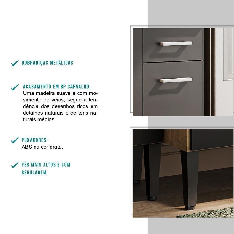 Armário Cozinha Compacta Arizona Smart Carvalho/preto Carraro A Cozinha Compacta Daiana da Carraro é o item perfeito para quem está procurando funcionalidade, organização e estilo para ambientes compactos. O produto é composto por uma torre quente de micro-ondas, um balcão de pia com gaveiteiro, um armário aéreo de 2 portas com espaço para porta temperos e um nicho.Especificações do Produto:Medidas totais: Largura: 225 cm | Altura: 182 cm | Profundidade: 44 cmMedidas da torre quente: Largura: 60 cm | Altura: 182 cm | Profundidade: 44 cmMedidas do balcão: Largura: 105 cm | Altura: 84,5 cm | Profundidade: 44 cmMedidas do aéreo: Largura: 105 cm | Altura: 55 cm | Profundidade: 27 cmMedidas do Nicho: Largura: 60 cm | Altura: 22 cm | Profundidade: 27 cmPeso total: 70,2 KgMatéria Prima: BPAcessórios: Pés com regulagem de alturaGarantia:Os produtos possuem garantia de 03 meses (se em condições normais), contra defeito de fabricação, ou componentes utilizados.Esta garantia não cobre defeitos por inadequado ou abusivo, falta de cuidados e desbotamento dos revestimentos.Condições de perda da garantia:- Mau ou manuseio incorreto.- Desbotamento ca pela exposição direta da luz solar.- Danos cas por agentes da , como inundações ou acidentes de qualquer espécie.- indevido de produtos abrasivos para realizar a limpeza.- Decurso do prazo estabelecido.Recomendações para uma boa conservação:- Não utilizar na limpeza produtos abrasivos tais como: palha de aço, álcool, vinagre, limão, saponáceo, ou produtos corrosivos que possam riscar ou descolar a película protetora dos móveis.- Na limpeza de móveis em geral, napas e fórmicas, deve ser utilizado um pano levemente umedecido e sabão neutro.- Para a movimentação do móvel é importante que este seja levantado do chão, pois ao arrastá-lo pode causar s estruturais.- Não deixe o móvel em exposição a intempéries.Informações importantes:- Trabalhamos para apresentar imagens fiéis ao produto real. Porém, as cores podem sofrer variações de acordo com o monitor, iluminação do ambiente em que se encontram e até por sua percepção visual comparado ao ambiente residencial.- Desta forma, as imagens são meramente ilustrativas.- Todos os objetos decorativos não acompanham o produto.- O produto é enviado desmontado.- O produto acompanha manual com instruções para a montagem.- A empresa Móveis Carraro não realiza o serviço de montagem.PERGUNTAS FREQUENTES- Existem outras cores disponíveis?Sim, este produto possui outras cores disponíveis em outros anúncios.- Vocês m para todas as regiões do Brasil? De que forma é feita a ?Sim, mos para todas as regiões do Brasil. E a é realizada por s parceiras.- EsteTodos os s produtos são novos. E acompanham e certificado de garantia.- Recebo o produto montado?Não, este produto é enviado desmontado. Junto com ele é enviado manual com instruções para a montagem.- Vocês realizam a montagem do produto?Não possuímos o serviço de montagem. Cor: Carvalho/Preto | Material: MDP | Cor Via Varejo: Preto | Estado de Origem: RS | Família da Cor: Preto | Peso: 68.199999999999989 | Altura do Produto: 182,5 | Largura: 289 | Profundidade: 44 | Peso do Produto Com Embalagem: 70.2 | Altura do Produto Com Embalagem: 20.5 | Largura do Produto Com Embalagem: 53.8 | Profundidade do Produto Com Embalagem: 168.2 | Produto precisa de Montagem?: Não | Nome: Armário Cozinha Compacta Arizona Smart Carvalho/Preto Carraro | Instruções/Cuidados: Nenhuma Informação | Conteúdo da Embalagem: Armário Cozinha Compacta Arizona Smart Carvalho/Preto Carraro | Nome do Simples no Fornecedor: Armário Cozinha Compacta Arizona Smart Carvalho/Preto Carraro | PrazoExp: 3 | Tipo de móveis de cozinha: Armário/Balcão