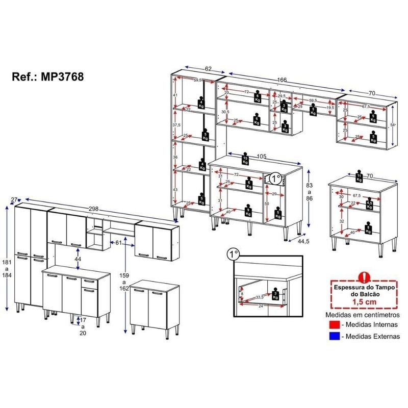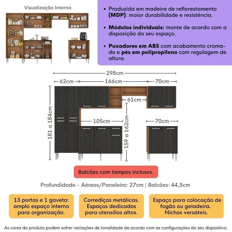 Armário Cozinha Modulada Completa 298cm Pequim Top Multimóveis Mp3768 Madeirado/pretoA Cozinha Modulada Completa 298cm Pequim Top Multimóveis MP3768 é a solução ideal para quem deseja mais organização e fluidez no dia a dia. Com modulação que remete a uma cozinha planejada e excelente aproveitamento de espaço, ela transforma a cozinha em um ambiente funcional, onde tudo fica no lugar certo e a rotina se torna muito mais prática.Diferenciais:- 3 anos de garantia contra defeitos de fabricação e material.- Produzida em madeira de reflorestamento (MDP 12/15mm): garante resistência e durabilidade.- Acabamento acetinado com cerca de 20% de brilho: visual sofisticado e facilidade na limpeza.- As opções de cor Preto/Lacca Fumê e Branco/Lacca Fumê possuem frentes com acabamento brilhante.- Composta por 5 módulos individuais, permitindo melhor adaptação ao seu espaço (nicho para fogão/geladeira é anexo ao aéreo).- Balcão com tampo de 15mm (compatível apenas com pia sob medida devido à profundidade).- Prateleiras internas e nichos externos que facilitam a organização de utensílios, mantimentos e eletros.- 13 portas com dobradiças metálicas: oferecem amplo espaço interno.- Compartimentos para armazenar utensílios mais altos com praticidade.- 1 gaveta com corrediças metálicas: ideal para talheres e itens de uso diário.- Espaço dedicado para fogão ou geladeira: otimiza o espaço do ambiente.- Puxadores em ABS com acabamento cromado: práticos e confortáveis ao manuseio.- Pés em polipropileno com regulagem de altura de 17 a 20cm: permitem um perfeito nivelamento aos módulos.Conteúdo da Embalagem:1 (um) Armário Aéreo com Nicho 166cm1 (um) Armário Aéreo 70cm1 (um) Paneleiro Duplo 62cm1 (um) Balcão com Tampo 105cm1 (um) Balcão com Tampo 70cmManual de MontagemKit FerragemDimensões do Produto Montado:Altura: 181 a 184cm | Largura: 298cm | Profundidade: 44,5cm (Balcões) - 27cm (Aéreos)*Espaço para Fogão/Geladeira - Altura: 159 a 162cm | Largura: 61cm*Você pode consultar as medidas detalhadas na imagem técnica do produto.*As cores do produto podem sofrer variações de tonalidade de acordo com as configurações do seu dispositivo.*Aqui na Loja Multimóveis, você pode concluir sua compra facilmente com toda segurança. A entrega é garantida e você está em 1° lugar.Imagem meramente ilustrativa. Decoração e eletros não acompanham o produto.O produto será entregue desmontado e não disponibilizamos o serviço de montagem. Acabamento: Pintura UV | Tonalidade: Preto | Material: MDP | Referência do Modelo: MP3768 | Coleção: Pequim | Instruções de Cuidado: Limpar com pano seco para retirar o pó. Não utilizar produtos químicos ou abrasivos a limpeza. Não aplicar lustra móveis. | Sistema de Montagem: O produto acompanha manual de montagem juntamente com kit ferragem. O produto será entregue desmontado e não disponibilizamos o serviço de montagem. | Produto Composto por: 1 aéreo com nicho 166cm, 1 aéreo 70cm, 1 paneleiro 62cm, 1 balcão com tampo 105cm, 1 balcão com tampo 70cm, manual de montagem e kit ferragem. | Altura Montado: 184 | Largura Montado: 298 | Profundidade Montado: 44.5 | Tamanho (L x A x P): 298 x 184 x 44,5 | Fabricante: Multimóveis | Requer Montagem: Sim | Quantidade de Portas: 13 | Quantidade de Gavetas: 1 | Quantidade de Prateleiras: 7 | Quantidade de Puxadores: 14 | Quantidade de Pés: 13 | Porta com Vidro: Não | Corrediça: Metálica | Material do Puxador: ABS | Material dos Pés: Polipropileno | Acompanha Pia Inox: Não | Balcão 120 cm compatível para uso de pia: Não | Tampo Incluso: Sim | Quantidade de Tampos: 2 | Material do Tampo: MDP | Espessura do Tampo: 1.5 | Com Prateleiras: Sim | Produto: Cozinha | Tipo: Modular | RBN: 17100674011 | Altura (cm): 184 cm | Largura (cm): 298 cm | Profundidade (cm): 44,5 cm | Acessórios incluídos: N/A | Altura do Produto com Embalagem: 36 cm | Ubicação do móvel: Não aplica | Largura do Produto com Embalagem: 72 cm | Comprimento do Produto com Embalagem: 170 cm | Peso do Produto com Embalagem: 95000 g | Tempo de Garantia: 3 meses | Destaque 1: Produzida em MDP: maior durabilidade e resistência. | Destaque 2: Tamanho do produto montado (L x A x P): 298 x 184 x 44,5 cm | Destaque 3: Módulos individuais: possibilitam a montagem conforme a disponibilidade do espaço. | Destaque 4: Amplo espaço interno para a organização eficiente de utensílios de cozinha e mantimentos. | Destaque 5: Pés em polipropileno com regulagem de altura: oferecem perfeita estabilidade aos módulos. | Tipo de móveis de cozinha: Cozinha completa | Marca: Multimóveis | Materiais do corpo: MDP | Materiais das portas: MDP | Altura do armário: 184 cm | Largura do armário: 298 cm | Profundidade do armário: 27 cm | Altura do balcão: 86 cm | Largura do balcão: 175 cm | Profundidade do balcão: 44,5 cm | Modelo detalhado: N/A | Peso (kg): 95 kg | Estilo: Moderno | Capacidade máxima de peso: N/A | Com Pés ajustáveis: Sim | Quantidade de caixas de embalagem: 03 | Peso do Produto: 95 | É personalizado: Não | Baterias são necessárias?: Não | Certificação de teste externa: Não aplicável | Is Fragile: Não | Peso do item: unit=kilograms;value=95 | Dimensões do item P x L x A: depth#value=44.5;depth#unit=centimeters;width#value=298;width#unit=centimeters;height#value=184;height#unit=centimeters | Quantidade de itens: 1 | Número da peça: | Duração da Garantia: 3 Meses | Montagem: Necessita Montagem | Tipo de Garantia: Garantia do Fabricante | Inclui manual de montagem: Sim | Palavras-chave: armario de cozinha, cozinha completa, cozinha compacta, cozinha planejada, cozinha modulada, balcao de cozinha, balcao de pia, cozinha modular, balcao cozinha, armario cozinha | Peso do balcão (kg): N/A | Peso do armário (kg): N/A | Componentes incluídos: Kit de instalação | Tipo da embalagem do vendor: Sem embalagem adicional | Cor: Madeirado/Preto