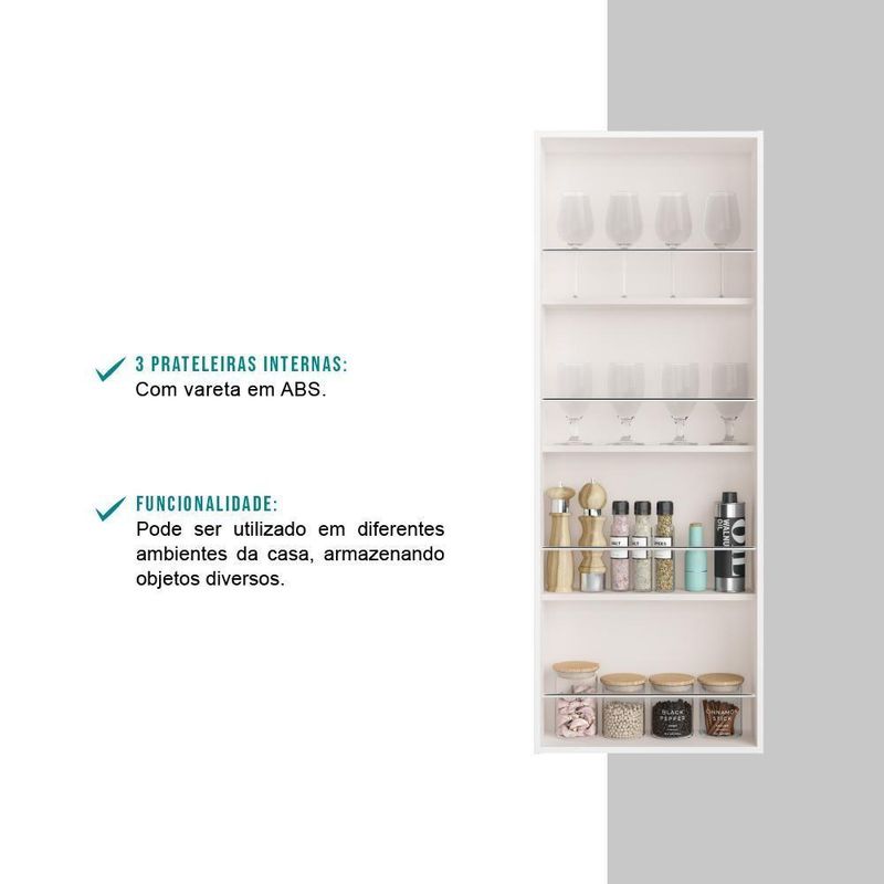 Armário Cozinha Utilitário 1 Porta Branco CarraroO Armário de Cozinha Carraro é a peça ideal para ser utilizada em diferentes cômodos da casa, ajudando a manter todos os objetos em ordem e assim facilitando as tarefas do dia a dia. É uma solução indispensável para quem precisa de mais espaço e organização para o ambiente, pois conta com diversas prateleiras internas, além de permitir ser fixada tanto na parede como na lateral de roupeiros.Especificações do Produto:Medidas: Largura: 44 cm | Altura: 119,6 cm | Profundidade: 15,3 cmPeso: 11 KgMatéria Prima: MDPPortas: 1 Porta de batenteSistema Abertura: Dobradiça 26mmPuxador: ABSPrateleiras: 3 (4 nichos)Acessórios: Vareta em ABS nas prateleirasPeso suportado em cada prateleira: Até 10 KgGarantia:Os produtos possuem garantia de 03 meses (se em condições normais), contra defeito de fabricação, ou componentes utilizados.Esta garantia não cobre defeitos por inadequado ou abusivo, falta de cuidados e desbotamento dos revestimentos.Condições de perda da garantia:- Mau ou manuseio incorreto.- Desbotamento ca pela exposição direta da luz solar.- Danos cas por agentes da , como inundações ou acidentes de qualquer espécie.- indevido de produtos abrasivos para realizar a limpeza.- Decurso do prazo estabelecido.Recomendações para uma boa conservação:- Dicas para limpeza e conservação do seu produto, você encontrará no esquema de montagem que o acompanha.Informações importantes:- Trabalhamos para apresentar imagens fiéis ao produto real. Porém, as cores podem sofrer variações de acordo com o monitor, iluminação do ambiente em que se encontram e até por sua percepção visual comparado ao ambiente residencial.- Desta forma, as imagens são meramente ilustrativas.- Todos os objetos decorativos não acompanham o produto.- O produto é enviado desmontado.- O produto acompanha manual com instruções para a montagem.- A empresa Móveis Carraro não realiza o serviço de montagem.PERGUNTAS FREQUENTES- Existem outras cores disponíveis?Sim, este produto possui outras cores disponíveis em outros anúncios.- Vocês m para todas as regiões do Brasil? De que forma é feita a ?Sim, mos para todas as regiões do Brasil. E a é realizada por s parceiras.- Este produto é novo ou ?Todos os s produtos são novos. E acompanham e certificado de garantia.- Recebo o produto montado?Não, este produto é enviado desmontado. Junto com ele é enviado manual com instruções para a montagem.- Vocês realizam a montagem do produto?Não possuímos o serviço de montagem. Altura (cm): 119,6 cm | Estado de Origem: RS | Cor Via Varejo: Branco | Material para Filtro: Madeira | Família da Cor: Branco | Peso: 11.00 | Espelho: Sem Espelho | Profundidade (cm): 15,3 cm | Cor: Branco | Pés: Sem Pés | Largura do produto (cm): 44 cm | PrzEx: 3 | Cômodo Indicado: Cozinhas | Tipo: Aéreo | Produto: Armário Multi | Nome do Simples no Fornecedor: Armário Aéreo Utilitário 1 Porta Branco Carraro | Instruções/Cuidados: Nenhuma Informação | Conteúdo da Embalagem: 1 Armário Aéreo Utilitário 1 Porta Branco Carraro | Peso do Produto com Embalagem (kg): 11 kg | Produto precisa de Montagem?: Sim, montagem e instalação do Painel | Altura do Produto com Embalagem (cm): 5,5 cm | Largura do Produto com Embalagem (cm): 123,5 cm | Comprimento do Produto com Embalagem (cm): 44,5 cm | Descrição do Tamanho: 5,5 cm x 123,5 cm x 44,5 cm