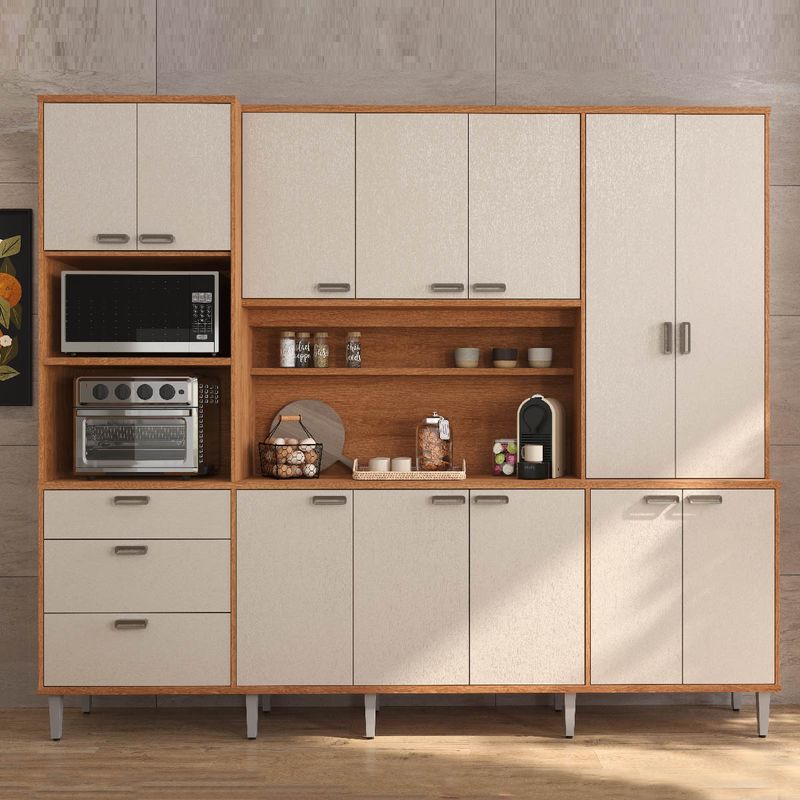 Armário de Cozinha Pulse 12 Portas 3 Gavetas Jequitibá/Areia - Lukaliam O Armário de Cozinha Pulse com 12 Portas e 3 Gavetas é a solução perfeita para organização e praticidade. Com amplo espaço interno, permite armazenar utensílios, mantimentos e louças com facilidade. Seu design moderno se adapta a diversos estilos de decoração, enquanto a estrutura resistente garante durabilidade. Ideal para manter a cozinha sempre organizada e funcional, unindo beleza e eficiência. Especificações Técnicas: Modelo: 904202 Cor: Jequitibá/Areia Conteúdo da Embalagem: 1 Armário Cozinha, Kit Ferragem e Manual de Montagem Não nos responsabilizamos pela montagem e instalação dos produtos. Garantia de fábrica: 90 dias contra defeito de fabricação. Tamanho montado: 220cm x 255cm x 41cm - Altura x Largura x Profundidade Peso suportado 80kg distribuídos; Produto MDP/MDF; Pintura Amadeirado; Gavetas com corrediças telescópicas; Gaveta com organizador de talheres em MDP; Tampo intermediário em MDP de 25mm; RECOMENDAÇÕES GERAIS: Seguir a ordem do manual de montagem; Evitar batidas e contato com objetos cortantes; Não deixe o móvel em locais muito úmidos; Limpar com pano levemente umedecido com água, seguido de pano seco; Não utilizar produtos químicos ou abrasivos; Evite incidência direta de luz solar; Informações importantes: • Fotos meramente ilustrativa. Os objetos que ambientam as fotos não acompanham o produto. • As cores do produto podem variar de acordo com o monitor, a iluminação do ambiente ou sua percepção visual. • A compra do produto não acompanha montagem/desmontagem. • Montagens, desmontagens e instalações são responsabilidades do cliente. Estes serviços não estão inclusos no valor do produto. Para evitar imprevistos na sua entrega, confira as dimensões do produto no momento da compra e certifique-se de que ele passará por elevadores, portas, escadas e corredores, já que nossa entrega não inclui a subida de lances de escada ou o içamento de produtos. • Verifique a complexidade antes de decidir montar sozinho, orientamos que este produto seja montado por um profissional de sua confiança, após a sua entrega. • Todas as instruções, manuais e peças necessárias para a montagem são fornecidos junto com o produto, não nos responsabilizamos pela instalação/montagem. • Fornecemos somente assistências, por defeitos de fábrica.