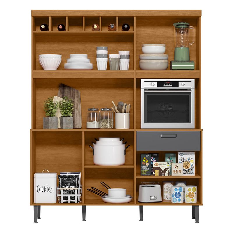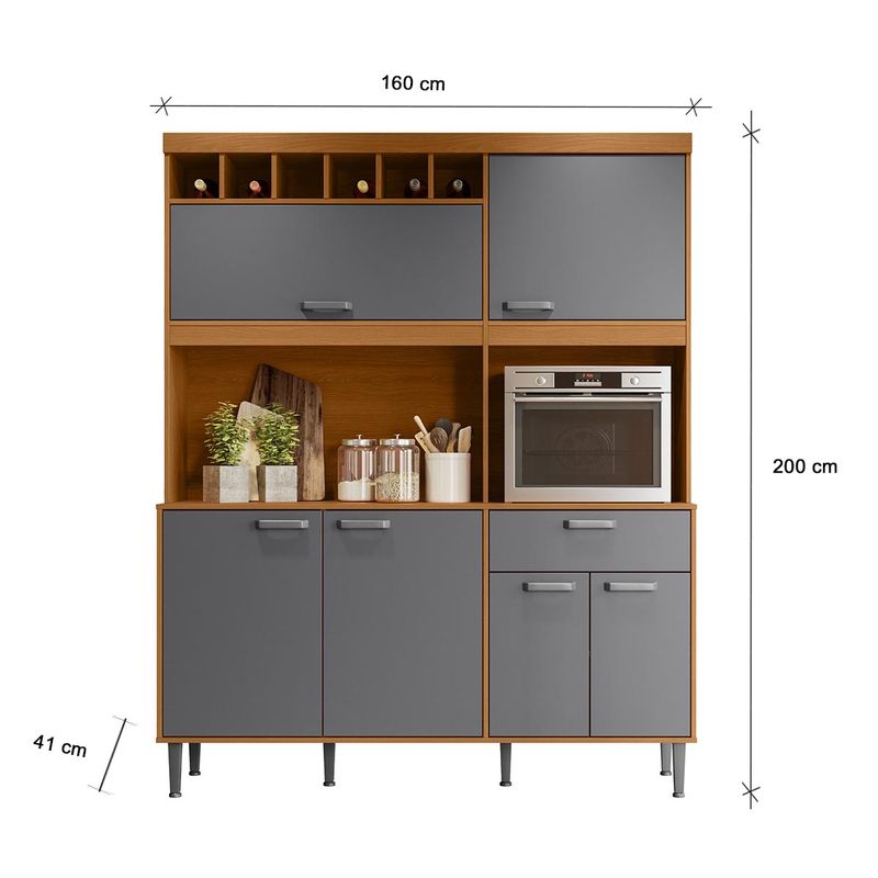 Armário de Cozinha Dakota 6 Portas 1 Gaveta e Adega para 6 Garrafas Jequitibá/Grafite - Lukaliam O Armário de Cozinha Dakota com 6 Portas, 1 Gaveta e Adega para 6 Garrafas é a escolha ideal para quem busca organização e elegância. Com amplo espaço para armazenar utensílios e mantimentos, sua adega integrada adiciona um toque sofisticado ao ambiente. O design moderno e a estrutura resistente garantem durabilidade e funcionalidade, tornando sua cozinha mais prática e estilosa. Especificações Técnicas: Modelo: 904348 Cor: Jequitibá/Grafite Conteúdo da Embalagem: 1 Armário Cozinha, Kit Ferragem e Manual de Montagem Não nos responsabilizamos pela montagem e instalação dos produtos. Garantia de fábrica: 90 dias contra defeito de fabricação. Tamanho montado: 200cm x 160cm x 41cm - Altura x Largura x Profundidade Peso suportado 50kg distribuídos; Produto MDP; Pintura Toque BP/Brilhante; Gaveta com corrediças telescópicas; Gaveta com organizador de talheres em MDP; Porta basculante com pistão a gás; Espaço para 6 garrafas; RECOMENDAÇÕES GERAIS: Seguir a ordem do manual de montagem; Evitar batidas e contato com objetos cortantes; Não deixe o móvel em locais muito úmidos; Limpar com pano levemente umedecido com água, seguido de pano seco; Não utilizar produtos químicos ou abrasivos; Evite incidência direta de luz solar; Informações importantes: • Fotos meramente ilustrativa. Os objetos que ambientam as fotos não acompanham o produto. • As cores do produto podem variar de acordo com o monitor, a iluminação do ambiente ou sua percepção visual. • A compra do produto não acompanha montagem/desmontagem. • Montagens, desmontagens e instalações são responsabilidades do cliente. Estes serviços não estão inclusos no valor do produto. Para evitar imprevistos na sua entrega, confira as dimensões do produto no momento da compra e certifique-se de que ele passará por elevadores, portas, escadas e corredores, já que nossa entrega não inclui a subida de lances de escada ou o içamento de produtos. • Verifique a complexidade antes de decidir montar sozinho, orientamos que este produto seja montado por um profissional de sua confiança, após a sua entrega. • Todas as instruções, manuais e peças necessárias para a montagem são fornecidos junto com o produto, não nos responsabilizamos pela instalação/montagem. • Fornecemos somente assistências, por defeitos de fábrica.