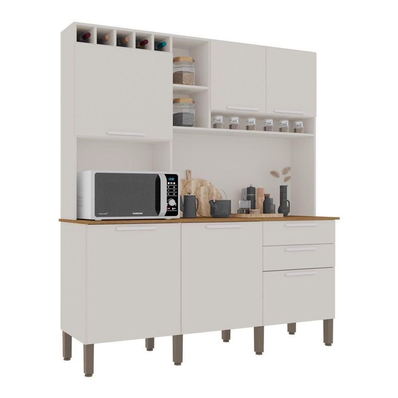 Armário De Cozinha 6 Portas 2 Gavetas New Topázio Salleto BrancoUma dica bacana para deixar a sua cozinha ainda mais bonita, organizada e completa, do jeitinho que você sempre sonhou é o Armário de Cozinha New Topázio. Ele possui diversos compartimentos para guardar utensílios e mantimentos quando você for preparar aquela deliciosa refeição, nichos para garrafas, prateleiras versáteis e um lindo e moderno design. Confeccionado com materiais de qualidade, a peça conta com 6 portas e 2 Gavetas com detalhes perfeitos para as suas necessidades do dia a dia. Aproveite e adquira este lindo armário para sua cozinha!?Pesos e DimensõesAltura (cm) 201 cmLargura (cm) 165 cmProfundidade (cm) 45 cmPeso (kg) 76,4 kgMateriais e AcabamentosMaterial Principal MDPMaterial da Corrediça MetálicaMaterial da Dobradiça/Corrediça da Porta MetálicaMaterial da Porta MDPAcabamento Pintura UVAcabamento da Gaveta Pintura UVEscala de Brilho Semi-BrilhoMaterial dos Pés PolipropilenoAcabamento da Porta PinturaMaterial da Gaveta MDPMaterial do Puxador da Gaveta MDFTipo de Corrediça da Gaveta Metálica TelescópicaEscala de Brilho da Porta Semi-BrilhoTipo de Dobradiça/Corrediça da Porta SimplesAcabamento da Prateleira Pintura UVEscala de Brilho da Prateleira Semi-BrilhoMaterial da Prateleira MDPMontagemNecessita Montagem SimComplexidade da Montagem Média: pode ser montado por mais de uma pessoa e/ou necessite de maior conhecimento para montagemSistema de Montagem Parafusos, Cavilhas, Dobradiças e Puxadores.Recomendações de Uso, Manutenção e Limpeza Para limpar corretamente seus armários de madeira, use sempre um pano liso e levemente umedecido com água.CaracterísticasQuantidade de Prateleiras 06 PrateleirasQuantidade de Gavetas 02 GavetasCor Cinamomo/Off WhiteTipo de Porta BaterMarca Sallêto MóveisSuporta Até (kg) 35 kgPossui Rodízio NãoPossui Prateleiras SimPossui Portas SimPossui Pés 08Possui Gavetas SimPeso Máximo por Prateleira 3 kgLinha ou Coleção New TopázioGaveta com Chave NãoEstilo ModernoSapatas Niveladoras SimCor do Produto Cinamomo/Off-WhitePeso Máximo por Gaveta 5 kgTipo de Puxador da Gaveta ExternoTipo de Puxador da Porta ExternoModular NãoTipo de Armário de Cozinha Cozinha CompactaOrigem do Produto NacionalAmbiente Principal CozinhaCor Predominante BegeItens InclusosItens Inclusos 1 Armário de Cozinha completo, Manual de Montagem e Kit Ferragens.