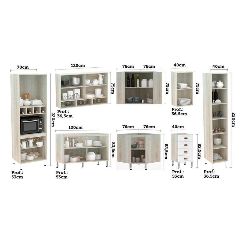Armário De Cozinha Completa 8 Peças Com Tampo Legno Crema Com Branco Pet Agatha Luciane Móveis Legno Crema Com Branco PetArmário de Cozinha Completa 8 Peças com Tampo Legno Crema com Branco Pet Agatha Luciane Móveis Uma cozinha modulada completa, para deixar seu ambiente super aconchegante e requintado. Composta por 8 peças cuidadosamente pensadas para sua organização. Os módulos são montados individualmente e permite a instalação da forma que melhor se adeque ao seu espaço. Contém um nicho com espaço para forno micro-ondas e nichos decorativos. Para este ambiente utilizamos como proposta de parede Lado da Pia: 266cm x 156cm Características: Produzido em MDP 15mm Corpo/Caixaria: Legno Crema F.F. Frontais: MDF Branco Pet Dobradiças: Slowmotion Metálicas Ø35mm Corrediças: Telescópicas Puxadores: Plástico Cobre Compõe o Kit: 1-Armário Aéreo 120 cm 2 Portas com Nicho Agatha Luciane Móveis Altura: 75 cm Largura: 120 cm Profundidade: 36,5 cm Peso: 31,8 kg 1-Armário Aéreo 40 cm 1 Porta Agatha Luciane Móveis Altura: 75 cm Largura: 40 cm Profundidade: 36,5 cm Peso: 13,8 kg 1-Armário Canto Diagonal 2 Portas Agatha Luciane Móveis Altura: 75 cm Largura: 76 cm Profundidade: 76 cm Peso: 27,8 kg 1-Balcão de Pia sem Tampo 120cm 2 Portas Agatha Luciane Móveis Altura: 82,5 cm Largura: 120 cm Profundidade: 53 cm Peso: 32,35 kg 1-Balcão de Cozinha sem Tampo 40cm 4 Gavetas Agatha Luciane Móveis Altura: 82,5 cm Largura: 40 cm Profundidade: 53 cm Peso: 22,3 kg 1-Balcão de Cozinha sem Tampo Canto Diagonal 1 Porta Agatha Luciane Móveis Altura: 82,5 cm Largura: 76 cm Profundidade: 76 cm Peso: 26,2 kg 1-Paneleiro 40 cm Raso Agatha Luciane Móveis Altura: 220 cm Largura: 40 cm Profundidade: 36,5 cm Peso: 34,7 kg 1-Paneleiro 70 cm com 1 Nicho Microondas 4 Portas Agatha Luciane Móveis Altura: 220 cm Largura: 70 cm Profundidade: 53 cm Peso: 61,5 kg 1-Tampo Luciane 40cm Altura: 2,5 cm Largura: 40 cm Profundidade: 54,5 cm Peso: 3,90kg 1-Tampo para Balcão 120cm em MDP 25mm com Acabamento em BP Luciane Móveis Altura: 2,5 cm Largura: 120 cm Profundidade: 54,5 cm Peso: 10,9 kg 1-Tampo Luciane Canto Diagonal 76 cm Altura: 2,5 cm Largura: 76 cm Profundidade: 76 cm Peso: 12kg Garantia do fornecedor de 3 meses. Informações complementares: Fique de olho: siga sempre as orientações do fabricante e utilize seu produto de acordo com o manual. A empresa não se responsabiliza pelo mau uso do produto, o que pode causar perda da garantia.#8239; Certifique se que seus dados estejam atualizados, como endereço e um telefone válido. A entrega será realizada no térreo, sendo assim em prédios o deslocamento da mercadoria, subir escadas, elevadores ou transporte por guincho para apartamentos fica sob responsabilidade do comprador. Todas as nossas entregas são realizadas em horário comercial, não sendo possível fazer agendamento, sugerimos acompanhar o rastreio do pedido e ter alguém para receber no endereço indicado. Não nos encarregamos por montagens, desmontagens e outras instalações, serão de responsabilidade do comprador.