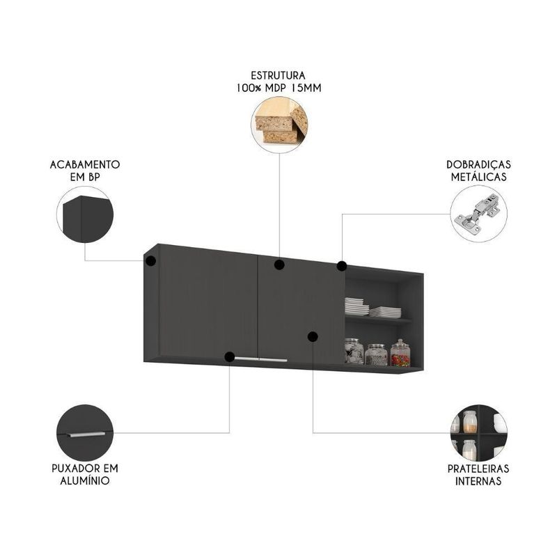 Armário De Cozinha Aéreo 150cm Pérola Z34 Preto - MpozenatoCompor a Cozinha com praticidade e estilo pode ser mais fácil do que você imagina. Com o Armário de Cozinha Aéreo 150cm Pérola Z34 Preto da Mpozenato, você transforma seu espaço, tornando-o mais moderno, funcional e perfeito para o seu dia a dia.Dispondo de duas portas com dobradiças metálicas, o Armário Aéreo garante abertura suave, enquanto os puxadores em alumínio conferem um toque de elegância ao ambiente. Os dois nichos na lateral se destacam por trazer um design sofisticado, podendo expor utensílios decorativos, temperos ou outros objetos. Sua estrutura em MDP 15mm com acabamento em BP, oferece resistência e durabilidade no uso, prolongando a vida útil do móvel. Com amplo espaço de armazenamento, o Armário de Cozinha possui prateleira interna para manter todos os seus utensílios organizados de maneira eficiente. Não perca a chance de renovar a sua casa com um produto de alta qualidade. Aproveite e adicione agora mesmo ao seu carrinho! Especificações Dimensões do Produto Largura: 150 cm. Altura: 54 cm. Profundidade: 29 cm. Peso: 24 Kg. Características do Produto Material da Estrutura: MDP 15mm. Material do Fundo: HDF 3mm. Peso Suportado: 34 Kg distribuídos. Acabamento: Melamina BP. Escala de Brilho: Fosco. Possui Portas: Sim. Quantidade de Portas: 2 Portas. Tipo de Porta: Convencional. Tipo de Dobradiças: Metálicas. Possui Puxador: Sim. Material do Puxador: Alumínio. Possui Prateleiras: Sim. Quantidade de Prateleiras: 1 Prateleira. Possui Nicho: Sim. Quantidade de Nichos: 2 Nichos. Diferenciais: - Design moderno. - Nichos para decoração. - Prateleira interna. - Puxadores em alumínio. - Dobradiças metálicas. Sistema de Montagem: Parafusos/Pregos. Manual de Montagem: Sim. Complexidade da Montagem: Baixa. Volumes: 1 Volume. Conteúdo da Embalagem: 1 Armário Aéreo. Garantia do Fabricante: 90 dias contra de fabricação. Montagem: Recomendamos que seja feita por um . Recomendação de Limpeza: Utilize pano levemente úmido. Largura: 150 | Cor: Preto | Modelo: Pérola | Tipo de Porta: Convencional | Acabamento: Melamina BP | Quantidade de Portas: 2 | Garantia: 90 Dias | Altura: 54 | Profundidade: 29 | Peso: 24 | Ambiente: Cozinha | Conteúdo da Embalagem: 1 Armário Aéreo | Volumes: 1 | Marca: Mpozenato | Requere montagem: Sim | Peso do Produto: | Manual: Sim | Tipo de móveis de cozinha: Armário | Quantidade de caixas de embalagem: 1 | Tamanho (tamanho): | Quantidade de Gavetas (quantidade_de_gavetas): | Indicado para TVs (indicado_para_tvs): | Descrição do Tamanho: 55X54X150 | Material (material): MDP | Tonalidade: Preto | Estado de Origem: PR | Garantia em Meses: 3 | Nome do Simples no Fornecedor: Mpozenato | Comprimento Produto Com Embalagem (cm): 55 | Altura do Produto com Embalagem (cm): 7 | Largura Produto com Embalagem (cm): 149 | Comprimento do Produto (cm): 55 | Altura do Produto (cm): 54 | Largura do Produto (cm): 150 | Peso Produto Com Embalagem (Kg): 25 | Peso do Produto (Kg): 25 | Material para Filtro: MDP | Materiais do corpo: MDP | Tipo de rodas (Leroy): Maciça | Requer montagem: Sim | Profundidade (Leroy): 29 | Condição do item: | Produto: Armário de Cozinha Aéreo 150cm Pérola Z34 Preto - Mpozenato | Material: Madeira | Tipo de Material: MDP | Material da Porta: Madeira | Garantia do Fabricante: 3 | Cômodo Indicado: Cozinhas | Altura da embalagem do vendor: 7 cm | Largura da embalagem do vendor: 149 cm | Peso da embalagem do vendor: 25 kg | Comprimento da embalagem do vendor: 55 cm | É personalizado: Não | Com prateleiras: Sim | Estilo: Moderno | Nome ML: Armário de Cozinha Aéreo 150cm Pérola Z34 Preto | Quantidade de gavetas: Não se aplica