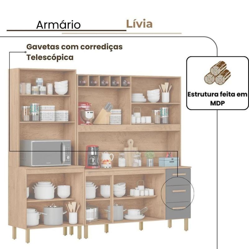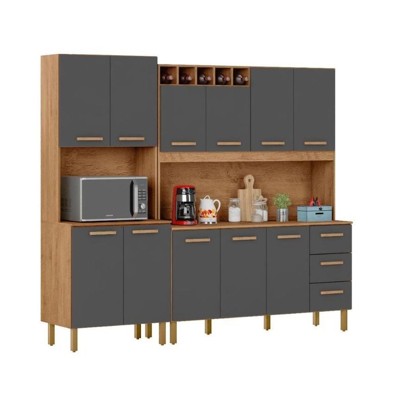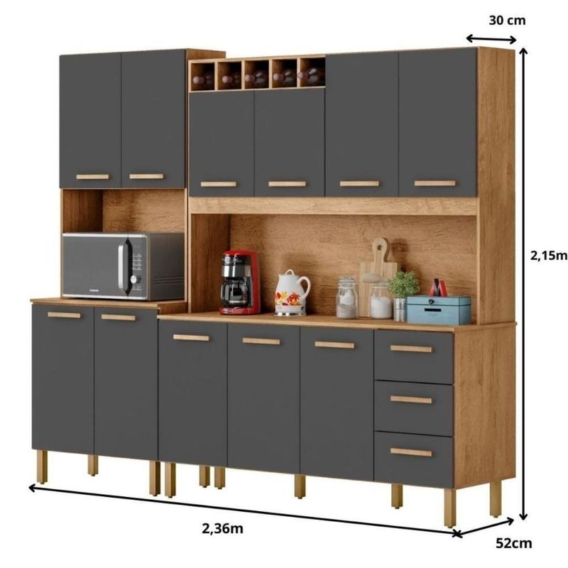 Armário De Cozinha Clara 11 Portas 2,36 Mt Amêndoa GrafiteArmário de Cozinha Clara 11 Portas 2,36 MT Amêndoa GrafiteMilani Movelaria – há mais de 10 anos produzindo móveis que unem qualidade e design.O Armário Clara 2,36 MT 11 Portas é perfeito para quem precisa de um móvel espaçoso, organizado e resistente para a cozinha. Com 11 portas bem distribuídas, ele facilita o dia a dia, permitindo guardar louças, mantimentos e utensílios de forma prática e segura.Este armário é ideal para famílias que desejam transformar a cozinha em um ambiente funcional e elegante, sem abrir mão da durabilidade.Principais benefícios:Amplo espaço interno: 11 portas para organizar todos os itens da cozinha.Praticidade: utensílios ao alcance das mãos, evitando bagunça.Design moderno: combina com qualquer estilo de cozinha.Durabilidade: material resistente, pensado para uso diário.Custo-benefício: espaço e qualidade em um único móvel.Especificações TécnicasModelo: Armário Clara 2,36 MT 11 PortasEstrutura: MDP de 15 mmMedidas: Largura 2,36 MT | Altura 2,00 MT |Profundidade: Superior: 30 cm | Inferior: 45cm |Portas: 11 com puxadores em MDFGavetas: 3 amplas Corrediça TelescópicaPés com regulagem de até 18,5 cmAcabamento:Pintura UV Amêndoa ( Foscos ) Grafite ( Fosco ).Garantia: 3 meses contra defeitos de fabricaçãoConteúdo da embalagem1 Armário Clara 2,36 MT 11 PortasKit de ferragens completoManual de montagemRecomendamos que a limpeza seja efetuada com pano seco e ou levemente umedecido. Não aplicar produtos químicos***Este produto não acompanha Tampo ou Cuba para Pia.* Foto Ilustrativa.Não acompanhando objetos de enfeites e eletros;Ao receber o produto verifique as condições da embalagem, em caso de avaria entre em contato conosco para orientações;Confira as dimensões do produto e certifique-se de que passarão normalmente por supostos elevadores, portas, escadas ou corredores de sua moradia;Entregamos os produtos na área urbana até a frente de sua moradia, ou seja, até sua porta se for casa ou portaria se for apartamento.A Loja não disponibiliza o serviço de montagem, a montagem é de total responsabilidade do comprador.Recomendamos que a montagem seja feita por um profissional da área.O Armário Clara transforma a sua cozinha, oferecendo organização, espaço e estilo.Garanta já o seu e aproveite o ambiente que você sempre quis! Requer montagem: Sim | Peso do Produto: 116 | Cor: Amêndoa/Grafite | Tonalidade: Marrom Claro | Altura: 215 | Largura: 236 | Acompanha Pia: Não | Acabamento: PiNTURA UV | Marca: Milani Movelaria | Fabricante: Milani Movelaria | Tipo de móveis de cozinha: Armario | Profundidade: 52 | Materiais do corpo: MDP 15MM | Modelo: Armário de Cozinha Clara 11 Portas 2,36 MT Amêndoa Grafite | Inclui manual de montagem: Sim | Quantidade de caixas de embalagem: 6