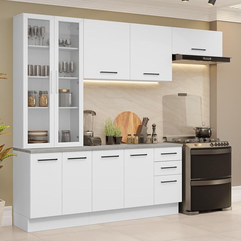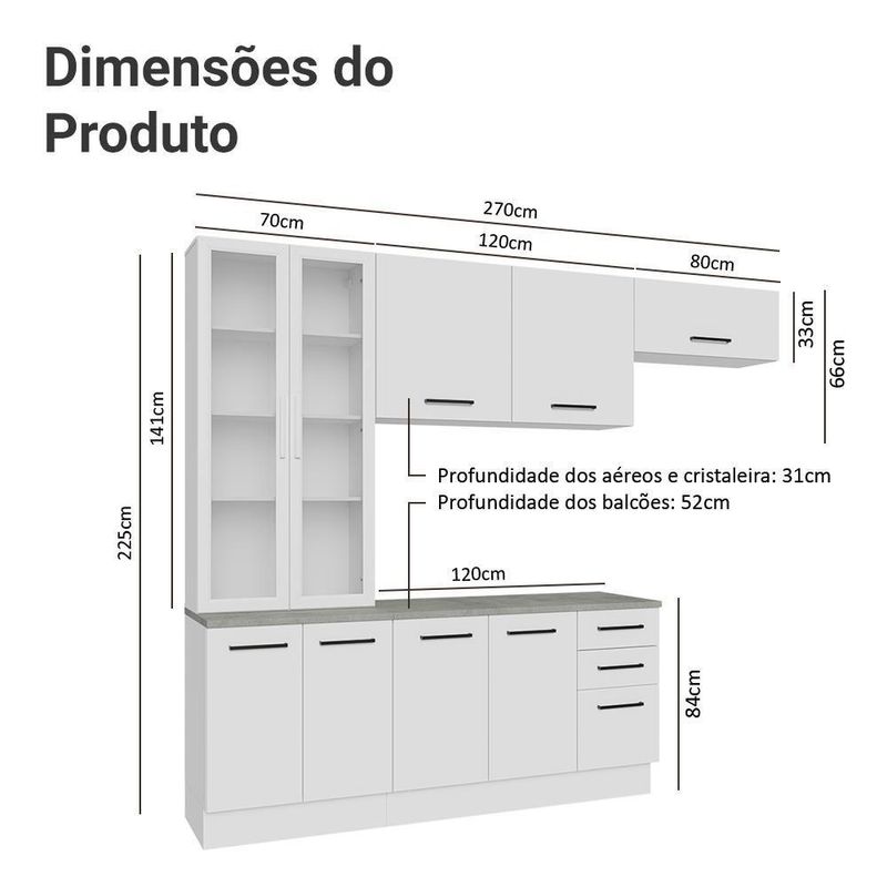 Armário De Cozinha Completa 270cm Branco Agata Madesa 11 BrancoA Cozinha Completa Agata da Madesa vai trazer modernidade e elegância para sua casa.O móvel se destaca pelos puxadores com alça em alumínio e gavetas com corrediças telescópicas de abertura total. Possui ainda portas com amortecimento para fechamento suave e pés reguláveis em PVC.Um dos grandes diferenciais é a cristaleira, que traz sofisticação ao ambiente. Com suas duas portas de vidro, ela oferece um espaço amplo e organizado, ideal para exibir louças, copos e objetos decorativos.Composta por módulos avulsos, esta cozinha pode ser organizada conforme a necessidade do seu ambiente. Além disso, é possível complementar sua cozinha futuramente com outros módulos da linha Agata.E para completar, o acabamento de alta resistência é brancoMedidas totais:- 225 cm de altura- 270 cm de largura- 52 cm de profundidade nos balcões e 31 cm nos aéreosO que você recebe:- Uma (1) Cristaleira de 70 cm com duas (2) portas- Um (1) Balcão de 70 cm com duas (2) portas e tampo- Um (1) Aéreo de 120 cm com duas (2) portas- Um (1) Balcão de 120 cm com duas (2) portas, três (3) gavetas e tampo- Um (1) Aéreo de 80 cm com uma (1) porta basculanteCódigo do produto: GRAG27001109É bom saber:- A cristaleira não acompanha pés nem kit para suspender na parede. Deve ser instalada sobre o balcão e fixada na parede.- As imagens são meramente ilustrativas, os eletros e a decoração não acompanham o produto- A Madesa não oferece de montagemA Madesa se dedica à sustentabilidade com várias iniciativas: temos uma usina própria para gerar energia que abastece uma de nossas fábricas. Selecionamos nossos fornecedores, priorizando aqueles que possuem um compromisso com a sustentabilidade e proteção do meio ambiente. Todo o plástico utilizado no setor produtivo é proveniente de reciclagem e as suas sobras são encaminhadas ao fornecedor que os recicla. Também investimos no desenvolvimento contínuo de nossos colaboradores e em ações educacionais que beneficiem a comunidade.COR: Branco | Garantia: 3 meses contra de fabricação | Dimensões - Altura: 225 cm | Dimensões - Largura: 270 cm | Dimensões - Profundidade: 52 cm | Peso aproximado: 150 kg | Produto: Cozinha Completa | Marca: Madesa | Material: MDP | RBN: Casa/Móveis/Móveis de Cozinha/Móveis de Cozinha Completa | Conteúdo da embalagem: Uma Cozinha Completa | Instruções/Cuidados: Utilize um pano limpo, levemente umedecido e seque em seguida a superfície. Não usar produtos químicos ou abrasivos para a limpeza. Recomendamos polir seu móvel com lustra-móveis duas a três vezes por ano. | Altura do Produto com Embalagem (cm): 79,9 | Largura Produto Com Embalagem (cm): 60,3 | Comprimento Produto Com Embalagem (cm): 158,2 | Peso Produto Com Embalagem (Kg): 149,84 | Produto precisa de Montagem?: Sim | Descrição do Tamanho: 225 cm x 270 cm x 52 cm | Estado de Origem: RS | Material para Filtro: MDP | Cômodo Indicado: Cozinhas | Nome do Simples no Fornecedor: Armário de Cozinha Completa 270cm Branco Agata Madesa 11 | do Fabricante: | Fabricante: Madesa | Quantidade de caixas de embalagem: 15 | Quantidade de portas: 9 | Quantidade de gavetas: 3 | Tipo de móveis de cozinha: Cozinha Completa | Inclui tampo: Sim | Tipo de Pé: Regulável | Materiais do corpo: MDP | Modelo: GRAG27001109 | É Frágil: Não | Quantidade de Itens: 1 | da peça: GRAG27001109 | Precisa de baterias ou pilhas: Não | Certificação de teste externa: Sim | Inclui manual de montagem: Sim | Componentes incluídos: Portas | Cor: Branco