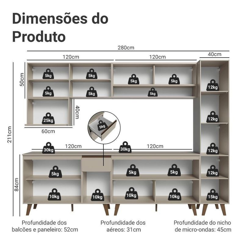 Armário De Cozinha Completa 280 Cm Crema Nice Madesa 02 CremaA Cozinha Completa é a solução perfeita para quem busca praticidade e organização. O armário com vidro pontilhado traz um toque de elegância ao ambiente enquanto o módulo aéreo projetado para acomodar fornos ou micro-ondas traz mais funcionalidade.A linha Nice chega em uma nova versão no tom crema, uma tonalidade suave que transmite aconchego e leveza. Outro diferencial está nos puxadores em bronze metalizado e pés em bronze sólido, que acrescentam um toque contemporâneo.Produzido com materiais de qualidade, o balcão conta com dobradiças metálicas nas portas e puxadores em perfil de alumínio, discretos e resistentes. O tampo é removível, o que permite a instalação de cuba ou pedra. O acabamento é de alta resistência, garantindo durabilidade.Medidas totais:- 211 cm de altura- 280 cm de largura- 52 cm de profundidade nos balcões e paneleiro, 31 cm nos aéreos e 45 cm no nicho para micro-ondasO que você recebe:- Um Armário Aéreo de 120 cm com duas portas- Um Nicho aéreo de 60 cm com espaço para forno- Um Armário Aéreo de 120 cm com duas portas em vidro pontilhado- Um Balcão de 120 cm com três portas e uma gaveta- Um Armário Aéreo de 120 cm com duas portas- Um Paneleiro de 40 cm com duas portasCódigo do produto: GRNC2800027PÉ importante saber:- Material: MDP- Imagens meramente ilustrativas, a decoração não acompanha o produto.- A Madesa não oferece de montagem.- O produto segue com manual e todas as ferragens necessárias.- Por , o paneleiro deve ser fixado na parece.A Madesa se dedica à sustentabilidade com várias iniciativas: temos uma usina própria que gera energia para uma das fábricas. Priorizamos fornecedores responsáveis com o meio ambiente. Todo o plástico utilizado na produção é reciclado, e as sobras também são reaproveitadas. Investimos no desenvolvimento de nossos colaboradores e em ações que beneficiem a comunidade. Cor: Bege | Garantia: 3 meses contra de fabricação | Dimensões - Altura: 211 cm | Dimensões - Largura: 280 cm | Dimensões - Profundidade: 52 cm | Produto: Cozinha Completa | Marca: Madesa | Peso aproximado: 150,4 kg | Material: MDP | Estado de Origem: RS | Conteúdo da embalagem: Uma Cozinha Completa | Material para Filtro: MDP | Instruções/Cuidados: Utilize um pano limpo, levemente umedecido e seque em seguida a superfície. Não usar produtos químicos ou abrasivos para a limpeza. Recomendamos polir seu móvel com lustra-móveis duas a três vezes por ano. | Produto precisa de Montagem?: Sim | Inclui tampo: Sim | Peso Produto Com Embalagem (Kg): | Altura do Produto com Embalagem (cm): 83,5 | Largura Produto Com Embalagem (cm): 66,1 | Comprimento Produto Com Embalagem (cm): 199,8 | Descrição do Tamanho: 211 cm x 280 cm x 52 cm | Nome do Simples no Fornecedor: Armário de Cozinha Completa 280 cm Crema Nice Madesa 02 | Fabricante: Madesa | RBN: Casa/Móveis/Móveis para Escritório em Casa | Quantidade de Gavetas: 1 | Quantidade de portas: 11 | Tipo de móveis de cozinha: Cozinha Completa | Materiais do corpo: MDP | Quantidade de caixas de embalagem: 10 | Bullet Point 1: Dimensões: 211 cm altura x 280 cm largura x 52 cm profundidade | Bullet Point 2: A linha Nice chega em uma nova versão no tom Crema, uma tonalidade suave que transmite aconchego e leveza | Bullet Point 3: Os puxadores em bronze metalizado e pés em bronze sólido, que acrescentam um toque contemporâneo | Bullet Point 4: Possui acabamento de alta resistência, conservando a beleza do móvel por muito mais tempo | É Frágil: Não | Quantidade de Itens: 1 | Certificação de teste externa: Sim | Modelo: GRNC2800027P | Componentes incluídos: Portas | Precisa de baterias ou pilhas: Não | da peça (part_number): GRNC2800027P | Peso do item (item_weight): ;unit=kilograms | Dimensões do item P x L x A (item_depth_width_height): depth#value=52;depth#unit=centimeters;height#value=211;height#unit=centimeters;width#value=280;width#unit=centimeters | Requer montagem (REQUIRES_ASSEMBLY): Sim | Inclui manual de montagem (INCLUDES_ASSEMBLY_MANUAL): Sim | Inclui manual de montagem: Sim | Cor: Crema