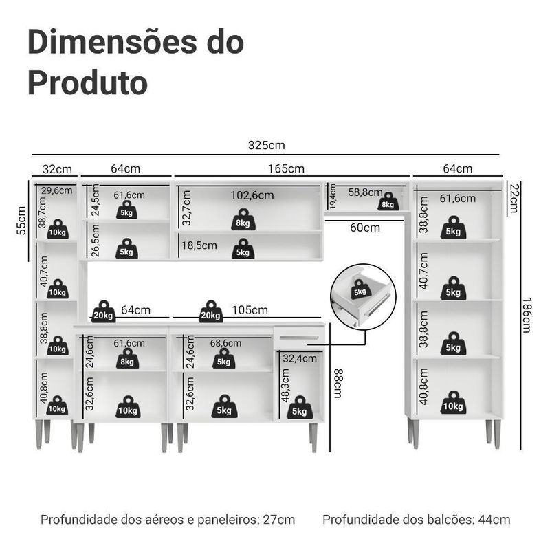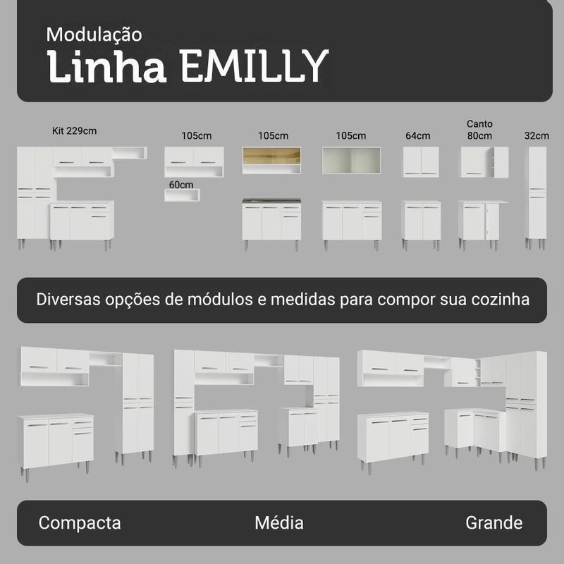 Armário De Cozinha Completa 325cm Branco Emilly Madesa 07 BrancoA Cozinha Emilly da Madesa é perfeita para o seu dia a dia, mesmo em espaços menores. Nesta composição você pode acomodar perfeitamente sua geladeira, deixando a cozinha completa e funcional.A linha Emilly se destaca pelo acabamento de alta resistência, puxadores em alumínio, corrediças e dobradiças metálicas, garantindo durabilidade no uso diário. Os pés reguláveis proporcionam estabilidade e facilitam a limpeza. O acabamento em Branco transforma o espaço, trazendo leveza para o seu dia a diaA cozinha é composta por diversos módulos, que permitem organizar os itens de forma prática: o paneleiro duplo acomoda utensílios maiores, o balcão e os armários aéreos com portas e nichos facilitam o acesso diário, e os demais módulos completam o espaço, permitindo distribuir os itens da forma que você preferir.Medidas totais:- 186 cm de altura- 325 cm de largura- 44 cm de profundidade nos balcões e 27cm nos aéreos/paneleiroO que você recebe:- Um paneleiro duplo com 4 portas- Um balcão com 3 portas, 1 gaveta e tampo- Um armário aéreo com 2 portas e 2 nichos abertos- Um balcão com 2 portas- Um armário aéreo com 2 portas- Um paneleiro com 2 portasCódigo do produto: GREM32500709É importante saber:- Material: MDP- Imagens meramente ilustrativas, a decoração não acompanha o produto- A Madesa não disponibiliza de montagem- Por , é obrigatório fixar o paneleiro e os aéreos na parede- O produto segue com manual de instalação e todas as ferragens necessárias para sua montagemA Madesa se dedica à sustentabilidade com várias iniciativas: temos uma usina própria que gera energia para uma das fábricas. Priorizamos fornecedores responsáveis com o meio ambiente. Todo o plástico utilizado na produção é reciclado, e as sobras também são reaproveitadas. Investimos no desenvolvimento de nossos colaboradores e em ações que beneficiem a comunidade. Cor: Branco | Garantia: 3 meses contra de fabricação | Dimensões - Altura: 186 cm | Dimensões - Largura: 325 cm | Dimensões - Profundidade: 44 cm | Produto (produto): Cozinha Completa | Marca: Madesa | Peso aproximado: 105 kg | Material: MDP | Estado de Origem: RS | Conteúdo da embalagem: Uma Cozinha Completa | Material para Filtro: MDP | Instruções/Cuidados: Utilize um pano limpo, levemente umedecido e seque em seguida a superfície. Não usar produtos químicos ou abrasivos para a limpeza. Recomendamos polir seu móvel com lustra-móveis duas a três vezes por ano. | Produto precisa de Montagem?: Sim | Peso Produto Com Embalagem (Kg): 104,80 | Altura do Produto com Embalagem (cm): 37,20 | Largura Produto Com Embalagem (cm): 67 | Comprimento Produto Com Embalagem (cm): 175,10 | Descrição do Tamanho: 186 cm x 325 cm x 44 cm | Nome do Simples no Fornecedor: Armário de Cozinha Completa 325cm Branco Emilly Madesa 07 | Fabricante: Madesa | RBN: Casa/Móveis/Móveis de Cozinha | Quantidade de caixas de embalagem: 4 | Bullet Point 1: Dimensões: 186 cm altura x 325 cm largura x 44 cm profundidade | Bullet Point 2: Com design inteligente, ela oferece tudo o que você precisa para manter utensílios, louças e mantimentos sempre à mão. | Bullet Point 3: Puxadores em alumínio e a utilização de corrediças e dobradiças metálicas. | Bullet Point 4: Possui acabamento de alta resistência, conservando a beleza do móvel por muito mais tempo. | É Frágil: Não | Quantidade de Itens: 1 | Certificação de teste externa: Sim | Componentes incluídos: Portas | Precisa de baterias ou pilhas: Não | da peça (part_number): GREM32500709 | Peso do item (item_weight): ;unit=kilograms | Dimensões do item P x L x A (item_depth_width_height): depth#value=44;depth#unit=centimeters;height#value=186;height#unit=centimeters;width#value=325;width#unit=centimeters | Requer montagem (REQUIRES_ASSEMBLY): Sim | Inclui manual de montagem (INCLUDES_ASSEMBLY_MANUAL): Sim | do modelo (model_number): GREM32500709 | Quantidade de Gavetas: 1 | Quantidade de portas: 15 | Tipo de móveis de cozinha: Cozinha Compacta | Materiais do corpo: MDP | is_assembly_required: Sim | Cor: Branco