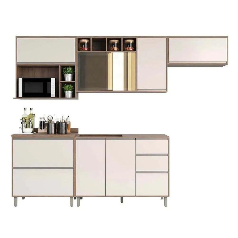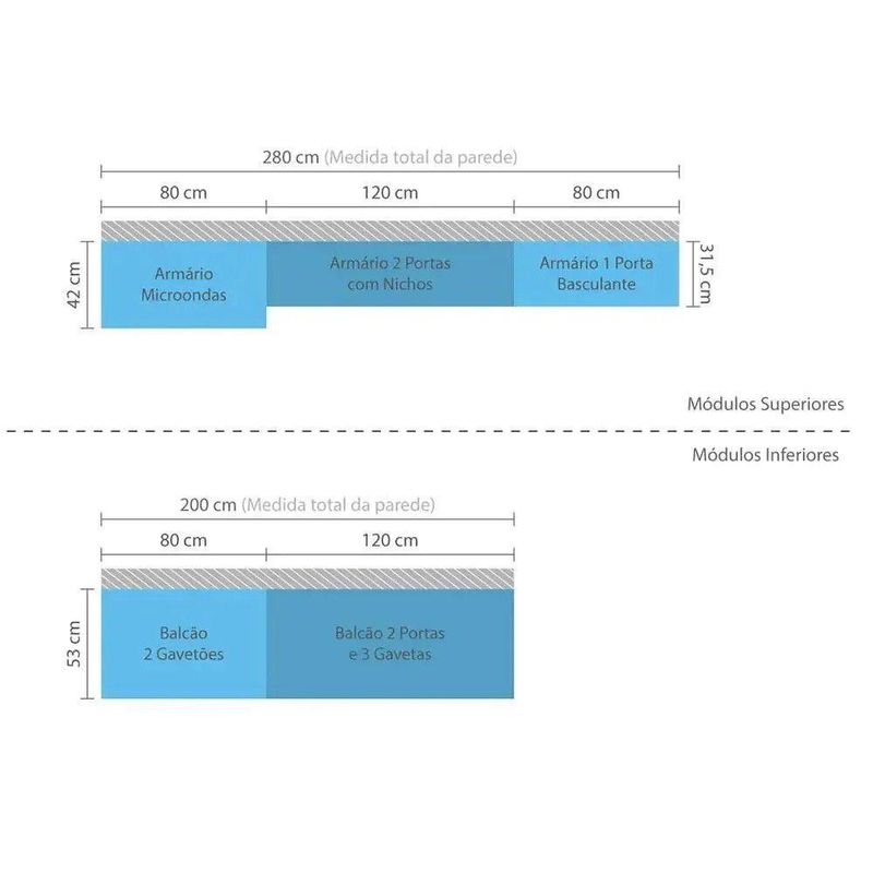 Armário De Cozinha Completa 5 Peças Com Vidro Reflecta Sem Tampo Mel Luciane Móveis Vanilla Com Pérola OffUma cozinha modulada linda, completa, para deixar seu ambiente super aconchegante e requintado. Composta por 5 pecas cuidadosamente pensadas para sua organizacao. As portas embutidas remetem ao planejado, com acabamento impecavel. Os modulos sao montados individualmente e permite a instalacao da forma que melhor se adeque ao seu espaco. Para este ambiente utilizamos como proposta 280cm de parede. Caracteristicas: Estrutura: 100 MDP Acabamento: Pintura UV Quantidade de Portas: 6 Tipo de Abertura das Portas: 3 de Abrir/Bater e 3 Basculantes Tipo de Dobradicas: Metalica Quantidade de Gavetas: 6 Tipo de Corredicas: Telescopicas Tipo de Puxador: Perfil Aluminio Gola Tipo de Pes: Plastico PS Champagne com regulagem de altura Sistema de Montagem: Cavilhas, Parafusos e Minifix Garantia: 3 meses Informacoes Complementares: 6 nichos decorativos. Tampo com rodatampo em MDP 25mm. Balcao de 120cm nao acompanha tampo ou pia. 1 Porta com moldura em Aluminio e Vidro Reflecta. 3 Portas basculantes com abertura auxiliada por pistao a gas. Espaco para forno ou micro-ondas. ATENCAO: Na utilizacao de forno eletrico/gas e OBRIGATORIA a retirada do fundo (risco de superaquecer). As dimensoes maximas do forno devem respeitar a margem de respiro, necessitando folga de 5cm entre o forno e as laterais do movel. Prateleiras suportam ate 10kg, gavetas 5kg e nichos 1kg. Distribua uniformemente os objetos. Ambiente composto por: 1 Armario Aereo 120cm 1 Porta de abrir 1 Porta Basculante Vidro Reflecta e Nicho Mel Luciane Moveis 73 x 120 x 31.5 (Altura x Largura x Profundidade - cm) 1 Armario Aereo 80 cm 1 Porta Basculante Mel Luciane Moveis 36,5 x 80 x 31,5 (Altura x Largura x Profundidade - cm) 1 Armario Aereo 80 cm 1 Porta Basculante Espaco Micro-ondas e Nicho Lateral Mel Luciane Moveis 82 x 80 x 42 (Altura x Largura x Profundidade - cm) 1 Balcao de Cozinha Para Pia Sem Tampo 120cm 2 Portas de abrir 3 Gavetas Mel Luciane Moveis 87 x 120 x 51,5 (Altura x Largura x Profundidade - cm) 1 Balcao de Cozinha com Tampo 80 cm 2 Gavetoes Mel Luciane Moveis 89,5 x 80 x 53 (Altura x Largura x Profundidade - cm).