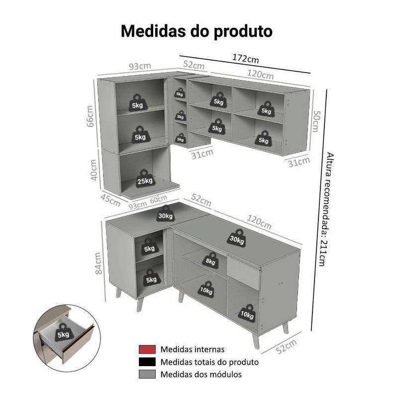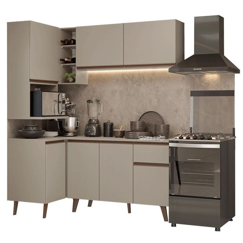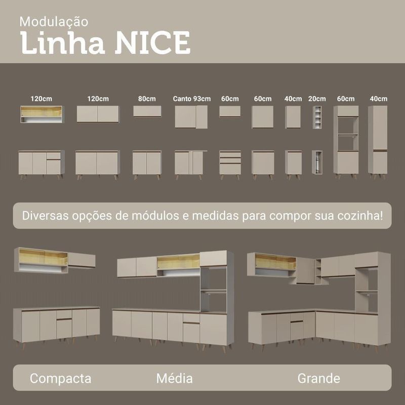 Armário De Cozinha Completa De Canto 265 Cm Crema Nice Madesa 05 CremaA Cozinha de Canto é perfeita para quem busca funcionalidade. Um dos destaques é o aéreo com adega acoplada, ideal para aproveitar ainda mais o espaço. Além disso, conta com um nicho para módulo de forno, garantindo praticidade.A linha Nice chega em uma nova versão no tom crema, uma tonalidade suave que transmite aconchego e leveza. Outro diferencial está nos puxadores em bronze metalizado e pés em bronze sólido, que acrescentam um toque contemporâneo.O balcão conta com dobradiças metálicas nas portas e puxadores em perfil de alumínio, discretos e resistentes. As gavetas possuem corrediças que permitem abertura total, oferecendo mais praticidade no uso diário. O tampo é removível, possibilitando a instalação de cuba ou pedra e o acabamento de alta resistência garante durabilidade no uso diário.Medidas totais:- 211 cm de altura- 265 cm de largura- 52 cm de profundidade nos balcões, 31 cm nos aéreos e 45 cm no nicho para micro-ondasO que você recebe:- Um Armário Aéreo de 120 cm com duas portas- Um Nicho aéreo de 60 cm com espaço para forno- Um Armário Aéreo de canto com adega acomplada- Um Balcão de 120 cm com três portas e uma gaveta- Um Balcão de canto com uma portaCódigo do produto: GCNC2650057PÉ importante saber:- Material: MDP- A Madesa não oferece de montagem.- O produto segue com manual e todas as ferragens necessárias.- Imagens meramente ilustrativas, a decoração não acompanha o produto.- O canto pode ser montado tanto para o lado esquerdo quanto para o lado direito.A Madesa se dedica à sustentabilidade com várias iniciativas: temos uma usina própria que gera energia para uma das fábricas. Priorizamos fornecedores responsáveis com o meio ambiente. Todo o plástico utilizado na produção é reciclado, e as sobras também são reaproveitadas. Investimos no desenvolvimento de nossos colaboradores e em ações que beneficiem a comunidade. Cor: Bege | Garantia: 3 meses contra de fabricação | Dimensões - Altura: 211 cm | Dimensões - Largura: 265 cm | Dimensões - Profundidade: 52 cm | Produto: Cozinha Completa | Marca: Madesa | Peso aproximado: 108 kg | Material: MDP | Estado de Origem: RS | Conteúdo da embalagem: Uma Cozinha Completa | Material para Filtro: MDP | Instruções/Cuidados: Utilize um pano limpo, levemente umedecido e seque em seguida a superfície. Não usar produtos químicos ou abrasivos para a limpeza. Recomendamos polir seu móvel com lustra-móveis duas a três vezes por ano. | Produto precisa de Montagem?: Sim | Inclui tampo: Sim | Peso Produto Com Embalagem (Kg): 108 | Altura do Produto com Embalagem (cm): 60,8 | Largura Produto Com Embalagem (cm): 66,1 | Comprimento Produto Com Embalagem (cm): 125,7 | Descrição do Tamanho: 211 cm x 265 cm x 52 cm | Nome do Simples no Fornecedor: Armário de Cozinha Completa de Canto 265 cm Crema Nice Madesa 05 | Fabricante: Madesa | RBN: Casa/Móveis/Móveis para Escritório em Casa | Quantidade de Gavetas: 1 | Quantidade de portas: 7 | Tipo de móveis de cozinha: Cozinha Completa | Materiais do corpo: MDP | Quantidade de caixas de embalagem: 7 | Bullet Point 1: Dimensões: 211 cm altura x 265 cm largura x 52 cm profundidade | Bullet Point 2: A linha Nice chega em uma nova versão no tom Crema, uma tonalidade suave que transmite aconchego e leveza | Bullet Point 3: Os puxadores em bronze metalizado e pés em bronze sólido, que acrescentam um toque contemporâneo | Bullet Point 4: Possui acabamento de alta resistência, conservando a beleza do móvel por muito mais tempo | É Frágil: Não | Quantidade de Itens: 1 | Certificação de teste externa: Sim | Modelo: GCNC2650057P | Componentes incluídos: Portas | Precisa de baterias ou pilhas: Não | da peça (part_number): GCNC2650057P | Peso do item (item_weight): value=108;unit=kilograms | Dimensões do item P x L x A (item_depth_width_height): depth#value=52;depth#unit=centimeters;height#value=211;height#unit=centimeters;width#value=265;width#unit=centimeters | Requer montagem (REQUIRES_ASSEMBLY): Sim | Inclui manual de montagem (INCLUDES_ASSEMBLY_MANUAL): Sim | Inclui manual de montagem: Sim | Cor: Crema