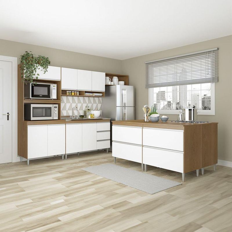 Armário De Cozinha Completa Modulada Com Ilha 8 Peças Menu Móveis BrancoA Cozinha Sabrina Modulada foi desenvolvida para atender todas as suas necessidades do dia a dia com um design moderno, funcionalidade e versatilidade. A Cozinha Modulada é a tendência do momento e foi arquitetada com módulos úteis que vão facilitar a sua rotina diária, preparos dos alimentos e armazenamento dos utensílios e mantimentos, mantendo sua cozinha sempre organizada. Por se tratar de armários de cozinha modulados você pode ajustar os módulos conforme o espaço disponível e montar diversas modulações diferentes para deixar o ambiente muito mais aconchegante. A elegância fica por conta dos puxadores em perfil e os pés na cor prata dando um toque único de sofisticação. A Cozinha Sabrina é produzida com materiais de excelente qualidade, garantindo a durabilidade e vida útil. O melhor em móveis no design atual aliando conforto, qualidade e ótimos preços, só na Menu Móveis!CARACTERÍSTICAS TÉCNICAS:- Produzida em MDP de 15 mm- Acabamento UV na cor Branco e Avelã- Portas com Dobradiça Metálica- Porta Basculante com Pistão a Gás- Gavetas com Corrediça Telescópica- Puxadores Perfil em ABS na cor Prata- Pés com Regulagem em ABS na cor Prata- Nicho Superior Forno Alt. 40 cm Larg. 77 cm Prof. 50,5 cm- Nicho Inferior Microondas Alt. 35 cm Larg. 77 cm Prof. 50,5 cm- Balcão para Pia de Larg. 120 x Prof. 52 cm, NÃO acompanha TAMPO e PIA- Balcão para Cooktop possui Tampo com Ranhura que pode ser utilizado com cooktop de 5 bocas, caso não cortar pode utilizar normalmente.MÓDULOS INCLUSOS NA COZINHA:1 x Armário Nicho - Larg. 80cm Alt. 202cm Prof. 31,5/52cm P. 44kg1 x Armário Aéreo - Larg. 120cm Alt. 60cm Prof. 31,5 cm P. 26kg1 x Balcão Pia - Larg. 120cm Alt. 88cm Prof. 52cm P. 36kg1 x Nicho - Larg. 80cm Alt. 30cm Prof. 31,5cm P. 8kg4 x Balcão Gavetão - Larg. 80cm Alt. 88cm Prof. 52cm P. 30kgINFORMAÇÕES TÉCNICAS:Altura Total: 202 cmLargura Total: 280 cmProfundidade Total: 31,5/52 cmPeso Total: 234 kgINFORMAÇÕES ADICIONAIS:*ATENÇÃO: Não trabalhamos e não nos responsabilizamos pela montagem do móvel. Antes da montagem conferir se o produto está de acordo com o que comprou, produto montado e danificado pela montagem não será aceito troca. Montagem e instalação por conta do comprador.**As imagens ambientadas são meramente ilustrativas e podem apresentar itens que não compõe o produto. As cores do produto podem variar de acordo com o monitor, a iluminação do ambiente ou sua percepção visual.***Limpeza: Deve ser feita com pano macio e seco ou levemente umedecido com água e sabão neutro. Não devem ser utilizados abrasivos como palha de aço e objetos cortantes.Garantia para defeitos de fabricação conforme Código de Defesa do Consumidor.Menu Móveis