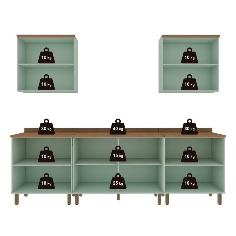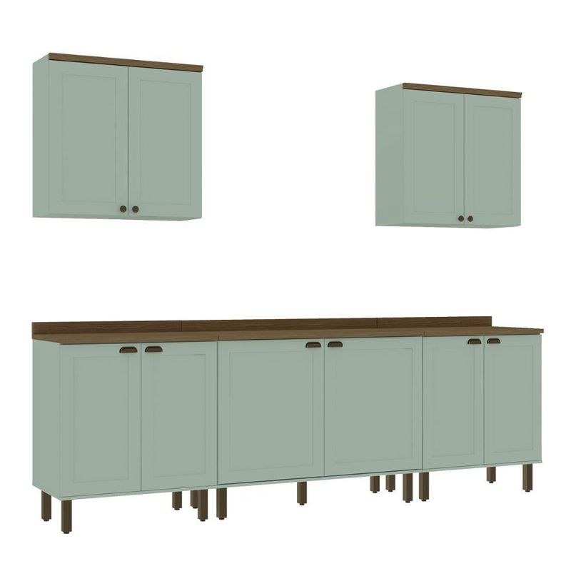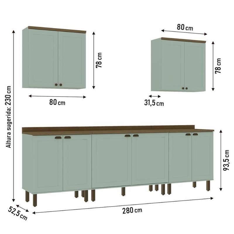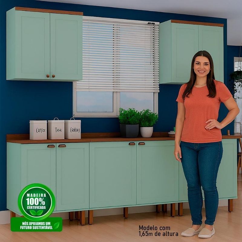 Armário De Cozinha Genialflex Iluminata 5 Peças Verde MintImagina entrar na sua cozinha todos os dias e se deparar com um espaço lindo, moderno e super organizado? O Armário de Cozinha Genialflex Iluminata 5 Peças Verde Mint chegou pra transformar seu ambiente de vez! Produzido 100% em MDF, ele une qualidade, resistência e aquele acabamento caprichado que faz toda diferença. São 5 peças que se encaixam perfeitamente, com portas no estilo provençal americano, puxadores modernos e pés robustos que dão um toque sofisticado. Além disso, você ainda conta com armários aéreos espaçosos e balcões bem divididos, pra deixar tudo no lugar e ao alcance das mãos. O tom Verde Mint traz leveza e frescor pro ambiente, enquanto os detalhes amadeirados no padrão Ébano dão aquele contraste aconchegante que todo mundo ama.A Genialflex acredita que sua casa merece muito mais do que apenas funcionalidade — ela merece estilo, conforto e aquele toque especial que deixa tudo com a sua cara. Por isso, a gente desenvolve peças modernas, resistentes e fáceis de combinar, sempre pensando em praticidade, qualidade e ótimo custo-benefício. Seja na cozinha, no quarto ou na sala, nossos móveis são feitos pra transformar o dia a dia em momentos mais leves, organizados e cheios de charme.MÓDULOS QUE COMPÕEM A COZINHA ILUMINATA 5 PEÇAS VERDE MINT- 2 balcões de 80 cm com 2 portas com tampo- 1 balcão de 120 cm com 2 portas com tampo- 2 armários aéreos de 80 cm com 2 portas cada- 2 tampos padrão Ébano para os balcões de 80 cm- 1 tampo padrão Ébano para o balcão de 120 cmESPECIFICAÇÕES- 100% MDF 15 mm- Portas com moldura provençal no estilo americano- Caixa em pintura UV e frentes em MDF/BP- Puxadores ABS (feito de plástico super resistente e leve, muito utilizado em móveis do dia a dia)- Dobradiças com amortecimento proporcionando um fechamento suave e silencioso- Tampos de 25 mm em MDF/BP impermeável- Cor Verde Mint (verde suave)- Tampos amadeirado padrão Ébano- Balcões com altura padrão de planejado (91 cm)- Módulos aéreos caracterizados por molduras engrossuradas- Pés com regulagem de alturaPESO SUPORTADO- Prateleiras até 10/15 kg distribuídos cada- Tampos até 30/40 kg distribuídos cada- Bases inferiores dos balcões até 18/25 kg cadaMEDIDAS DA COZINHA- Largura: 280 cm- Altura: 230 cm- Profundidade: 52,5 cmINSTRUÇÕES DE MONTAGEMO produto acompanha kit de ferragens e manual de montagem (serviço de montagem não incluso).CONTÉM NA EMBALAGEMO produto é enviado desmontado em 13 volumes, devidamente protegidos com papelão, isopor e plástico termoencolhível.TIPO DE FIXAÇÃOA fixação é feita com girofix, cavilhas e parafusos (não é necessário fixar na parede).DÚVIDAS COMUNSO produto é entregue montado?Não, os móveis são enviados desmontados, com um manual e todos os componentes necessários para a montagem.Vocês oferecem serviço de montagem?Não oferecemos serviço de montagem.Qual é o valor da entrega?O valor da entrega é calculado de acordo com o CEP de destino.Os produtos são novos?Sim, todos os nossos produtos são novos.Vocês entregam em todo o Brasil?Sim, realizamos entregas para todo o território nacional.LIMPEZAPara a limpeza, use um pano levemente umedecido com água. Evite produtos abrasivos e esponjas de aço.GARANTIACobertura de 3 meses contra defeitos de fabricação.CONSIDERAÇÕES IMPORTANTES- Durante a montagem, as peças devem ser montadas com a parte de trás voltada para cima, apoiando o móvel sobre o papelão da embalagem para evitar danos.- Evite o contato com fontes de calor ou umidade.- As imagens são meramente ilustrativas e os objetos decorativos não estão inclusos.- As cores podem variar dependendo da configuração da tela do dispositivo.- A entrega será realizada até a porta de entrada ou portaria do endereço informado. Caso autorizado pela portaria, o produto será deixado no andar térreo. O transporte até o interior do imóvel é responsabilidade do cliente. Altura: 230 cm | number_of_items: 1 | model_number: CB0037.01 | Comprimento: 52,5 cm | batteries_required: Não | Material para Filtro: MDF | Altura do Produto Com Embalagem (cm): 73,3 | Peso Produto Com Embalagem (Kg): 161,569 | Altura do Produto (cm): 230 | Material: MDF | bullet_point_#0: Design sofisticado e funcional – Cozinha completa com 5 peças em MDF 100%, portas no estilo provençal americano, puxadores modernos e pés reguláveis que garantem charme e praticidade no dia a dia. | is_fragile: Não | number_of_boxes: 13 | Comprimento do Produto Com Embalagem (cm): 127,6 | Profundidade: 52,5 cm | Largura do Produto (cm): 280 | item_weight: 151,883 | Peso do Produto (Kg): 152 | Descrição do Tamanho: 280 x 230 x 52,5 | Inclui manual de montagem: Sim | included_components: Ferragens | Requer montagem: Sim | part_number: Não aplicável | item_depth_width_height: 52,5 x 280 x 230 | Largura do Produto Com Embalagem (cm): 60,7 | Cor: Verde Mint | external_testing_certification: Não aplicável | Produto: Armário de Cozinha | is_assembly_required: Sim | bullet_point_#1: Espaço de sobra para organizar – Balcões bem divididos e armários aéreos espaçosos, com dobradiças slow motion que oferecem fechamento suave e silencioso. Tudo planejado para deixar sua cozinha sempre arrumada e prática. | bullet_point_#2: Estilo que transforma o ambiente – O tom Verde Mint transmite leveza e modernidade, enquanto os tampos amadeirados no padrão Ébano trazem contraste aconchegante, criando um visual elegante e acolhedor. | Manufacturer: Genialflex | power_source_type: Não aplicável | color: Verde Mint | Fabricante: Genialflex | Comprimento do Produto (cm): 52,5 | Materiais do corpo: MDF | Tipo de móveis de cozinha: Armário de Cozinha
