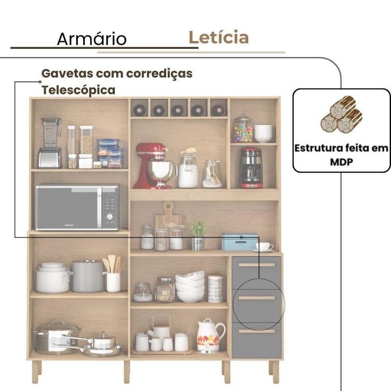 Armário De Cozinha Letícia 1,77 Mt 9 Portas Amêndoa GrafiteArmário de Cozinha Letícia 1,77 MT 9 Portas Amêndoa Grafite Milani Movelaria – Há mais de 10 anos fabricando móveis de qualidade para o seu lar.Está cansado da falta de espaço e da desorganização na cozinha?O Armário Letícia 1,77 MT com 9 Portas foi desenvolvido exatamente para resolver esse problema. Ele é um móvel espaçoso, funcional e com acabamento moderno, que vai transformar o ambiente da sua casa em um espaço mais prático e agradável.Vantagens do Armário LetíciaEspaço de sobra: com 9 portas, você consegue guardar louças, panelas, mantimentos e utensílios de forma organizada.Design moderno: combina facilmente com diferentes estilos de cozinha, deixando o ambiente mais bonito.Durabilidade: produzido em material resistente, feito para acompanhar o dia a dia da sua família.Especificações TécnicasModelo: Armário Letícia 1,77 MT 9 PortasEstrutura: MDP de 15 milímetrosMedidas: Largura 1,77 MT | Altura 2,00 MT |Profundidade: Superior: 30 cm | Inferior: 45 cm |Portas: 9 com puxadores em MDFAcabamento: Pintura UV Amêndoa ( Fosco ) Grafite ( Fosco ).3 Gavetas Corrediças metálicasPés com regulagem de alturaGarantia: 3 meses contra defeitos de fabricaçãoO que vai junto na embalagem1 Armário Letícia 1,77 MT 9 PortasKit de ferragens para montagemManual de instruçõesRecomendamos que a limpeza seja efetuada com pano seco e ou levemente umedecido. Não aplicar produtos químicos.***Este produto não acompanha Tampo ou Cuba para Pia.* Foto Ilustrativa.Não acompanhando objetos de enfeites e eletros;Ao receber o produto verifique as condições da embalagem, em caso de avaria entre em contato conosco para orientações;Confira as dimensões do produto e certifique-se de que passarão normalmente por supostos elevadores, portas, escadas ou corredores de sua moradia;Entregamos os produtos na área urbana até a frente de sua moradia, ou seja, até sua porta se for casa ou portaria se for apartamento.A Loja não disponibiliza o serviço de montagem, a montagem é de total responsabilidade do comprador.Recomendamos que a montagem seja feita por um profissional da área.O Armário Letícia é ideal para quem busca organização, praticidade e elegância em um só móvel. Uma escolha segura para quem valoriza qualidade e custo-benefício. Aproveite agora e garanta o seu! Requer montagem: Sim | Peso do Produto: 84 | Cor: Amêndoa/Grafite | Tonalidade: Marrom Claro | Altura: 200 | Largura: 177 | Acompanha Pia: Não | Acabamento: PiNTURA UV | Marca: Milani Movelaria | Fabricante: Milani Movelaria | Tipo de móveis de cozinha: Armario | Profundidade: 45 | Materiais do corpo: MDP 15MM | Modelo: Armário de Cozinha Letícia 1,77 MT 9 Portas Amêndoa Grafite | Inclui manual de montagem: Sim | Quantidade de caixas de embalagem: 3