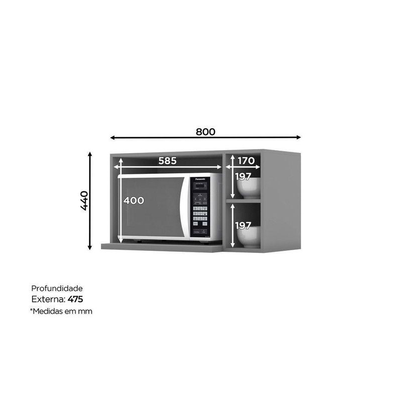 Armário De Cozinha Micro-ondas Belize Henn CinzaArmário de Cozinha Micro-ondas Belize, possui de Altura 440mm, Largura 800mm e Profundidade de 475mm. Produzida 100 MDF. A cozinha Belize é uma mistura de estilos bem diferentes, porque estilo mesmo é ter a história dos nossos clientes contadas em cada detalhe do projeto. Disponibiliza vários itens na sua modulação, estes possibilitam diversas composições para montar a cozinha dos seus sonhos. A combinação do acabamento, transmite uma atmosfera moderna. Os detalhes desta cozinha são de encher os olhos! Esse com certeza vai ser o espaço mais caloroso do seu lar e sem dúvida alguma. CARACTERÍSTICAS GERAIS: Estilo: Moderno Linha: Belize Ambiente Principal: Cozinha Marca: Henn Origem: Garantia do Fornecedor: 3 Meses Itens Inclusos: Um Armário de Cozinha e Instrução de Montagem ATENÇÃO / IMPORTANTE: Necessita Montagem: Sim Sistema de Montagem: Parafusos e Cavilhas Montagem : Não Complexidade de Montagem: Média pode ser montado por mais de uma pessoa ou necessitar maior conhecimento de montagem. Montagem/Instalação a cargo do cliente. Não dispomos de montadores. Mas acompanha manual para montagem, bastante intuitivo. Recomendações de Uso, Manutenções e Limpeza: Para limpeza de seu móvel, use uma flanela limpa e seca. Não utilize produtos químicos que possam danificar o produto. As imagens são meramente ilustrativas. As cores podem sofrer alterações devido a luminosidade, monitor e a percepção do usuário. Desmontagens, subir escadas/elevadores ou por guincho para apartamentos, e suas despesas são a cargo do cliente. Eletros, Eletrônicos e decorações não acompanham o produto. Nossa garantia é contra de fabricação, a qual tem um prazo de 3 meses contados a partir da data de do produto. Nossa garantia NÃO cobre por uso inadequado, abusivo ou falta de cuidados com o produto. FICHA TÉCNICA: Cor Interna: Trama Acabamento: Pintura UV Texturizada Escala de Brilho: Fosco Material do Fundo: MDF Material Principal: MDF Qtd. Portas: Não possui Material da Dobradiça: Não possui Material do Puxador Porta: Não possui Tipo Porta: Não possui Qtd. Prateleiras: 01 Peso Máximo por Prateleira: 8 kg Material da Prateleira: MDF Produto Suporte até (Kg): 8 Kg Medidas Montado (A x L x P): 44 x 80 x 47,5 CmCor: Cinza