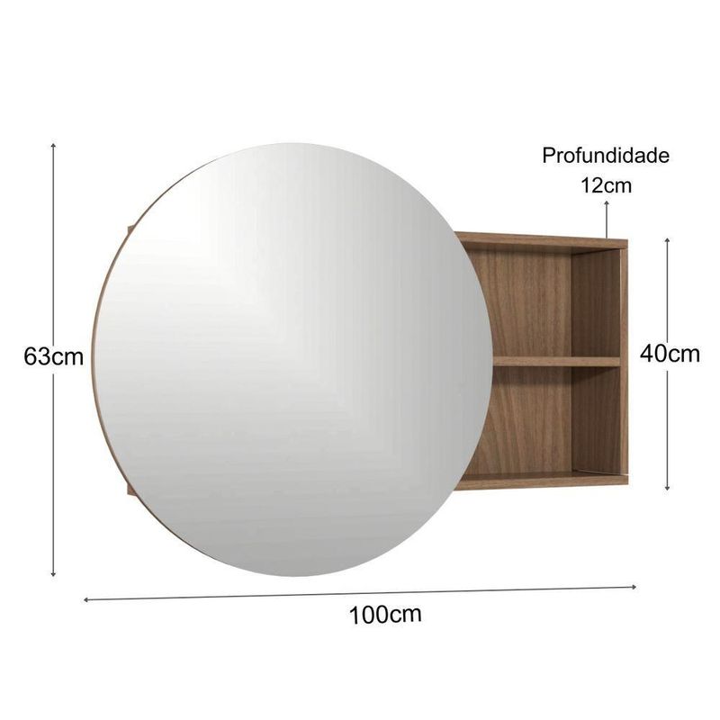 Armário Espelheira para Banheiro Luna MDF com Espelho Redondo Suspenso 100CM JequitibáOrganize o banheiro com o armário espelheira Venturi Luna, ideal para quem busca funcionalidade e design em um só produto. Com espelho redondo e armário embutido, ajuda a manter itens de higiene e beleza sempre organizados e discretos. A prateleira integrada facilita o acesso aos objetos de uso diário, deixando tudo à mão sem ocupar espaço extra. Produzida em MDF/MDP de 15 mm, oferece resistência e um acabamento que valoriza o ambiente. Seu formato suspenso de 100 cm de largura se adapta bem a banheiros e lavabos de diferentes estilos de decoração.Vantagens e diferenciais Espelho redondo com armário: combina visual moderno com espaço para itens de higiene. Prateleira integrada: mantém produtos de uso diário sempre à mão e organizados. Estrutura em MDF/MDP 15 mm: garante resistência e bom acabamento no banheiro. Instalação suspensa: otimiza o espaço e facilita a limpeza do piso do banheiro. Dimensões amplas: 100 cm de largura para melhor aproveitamento da área da pia.Especificações Técnicas Marca: Venturi Modelo: Luna Tipo de produto: Armário espelheira para banheiro Formato do espelho: Redondo Possui armário: Sim Material da estrutura: MDF/MDP 15 mm Tipo de instalação: Suspenso (fixado na parede) Altura do produto: 63 cm Largura do produto: 100 cm Profundidade do produto: 12 cm Peso do produto: 14 kg Conteúdo da embalagem: 1 espelheira Garantia: 3 meses de fábricaObservações importantes A montagem ou instalação é de responsabilidade do comprador. Verifique se o local de entrega possui espaço e acesso adequados conforme as dimensões do produto. A entrega é realizada no térreo, não incluindo subida de escadas ou içamento. O produto não acompanha itens decorativos ou acessórios utilizados nas imagens.
