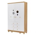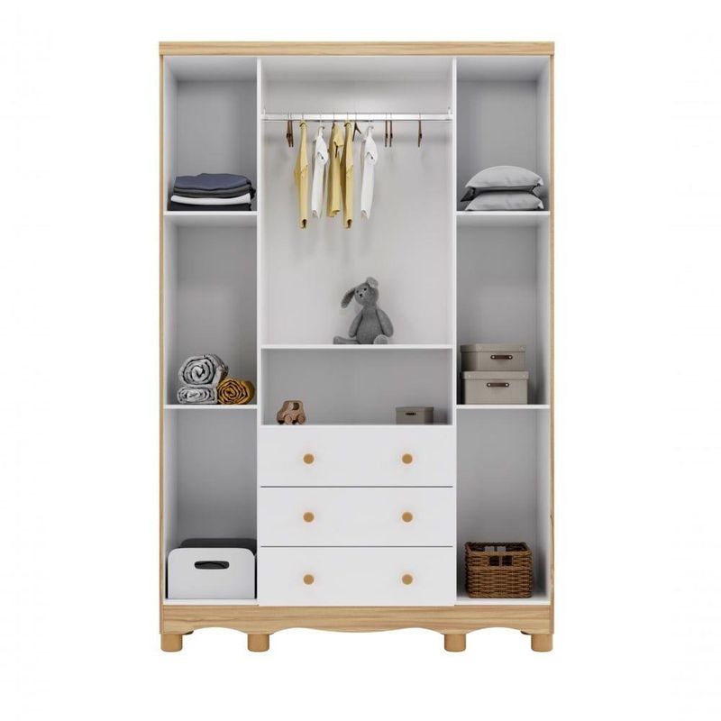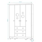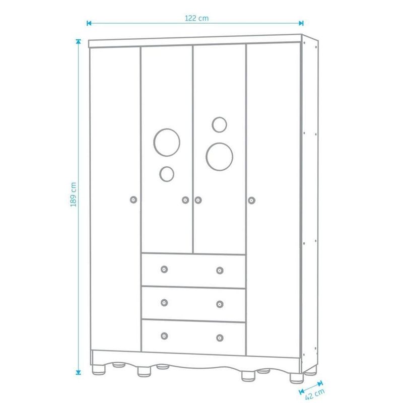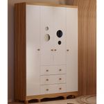 Armário Infantil 4 Portas Bolinha - Moveis Peroba Amendoa/brancoO Armário Bolinha New 4 Portas é um produto 100% MDF e possui pintura atóxica. Sua estrutura é fabricada em chapa de 12 mm e seus pés são injetados em plástico de alta resistência. Os puxadores são também em plástico. Os cabideiros são metálicos e suas gavetas possuem corrediças apoiadas metálicas. Acompanha dois modelos de rodapés que podem ser definidos no momento da montagem e suas portas possuem detalhe com PETG cristal.MedidasAltura: 188,5 cmLargura: 122,1 cmProfundidade: 41,5 cmMaterial PrincipalMDFMaterial dos FundosHDFAcabamento PrincipalVerniz UVLimpeza e ConservaçãoPara limpeza utilizar somente pano limpo e macio, ligeiramente umedecido em água (apenas o bastante para remover a poeira), seguido de um pano seco.Qtd de Prateleiras8Material da PrateleiraMDFEscala de Brilho da PrateleiraSemibrilhoPeso Máximo por Prateleira (kg)5Qtd de Gavetas3Acabamento da GavetaPintura UV e Fita de BordoTipo de Puxador da GavetaPerfil externoMaterial do Puxador da GavetaMDF revestidoNecessita de MontagemSimComplexidade da MontagemAlta: deve ser montado por um montador especializado.Observações:- Todos os produtos têm três (03) meses de garantia fornecida pelo fornecedor- As imagens são meramente ilustrativas, os objetos que ambientam as fotos não acompanham o produto.- Pode haver alguma diferença de tonalidade entre a foto e o produto, devido ao tratamento de imagens e a calibração do monitor- A entrega é realizada por transportadora, não nos responsabilizamos, no ato da entrega por desmontagens, subir escadas/elevadores ou transporte por guincho para apartamentos- Eventuais despesas são de responsabilidade do cliente- Confira as dimensões dos volumes e certifique-se de que passará normalmente por supostos elevadores, portas, escadas ou corredores- Ao receber a mercadoria, verifique as condições da embalagem, caso haja alguma avaria, entre em contato com nosso SAC- Nossa empresa não se responsabiliza pela montagem dos produtos, mas todos os produtos possuem manual de montagem. Recomendamos que a montagem seja feita por profissional de sua confiança.