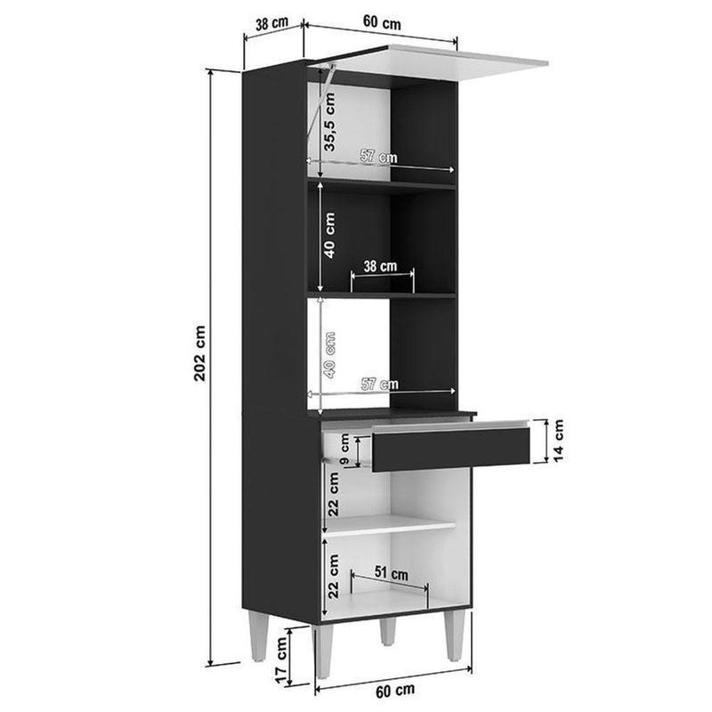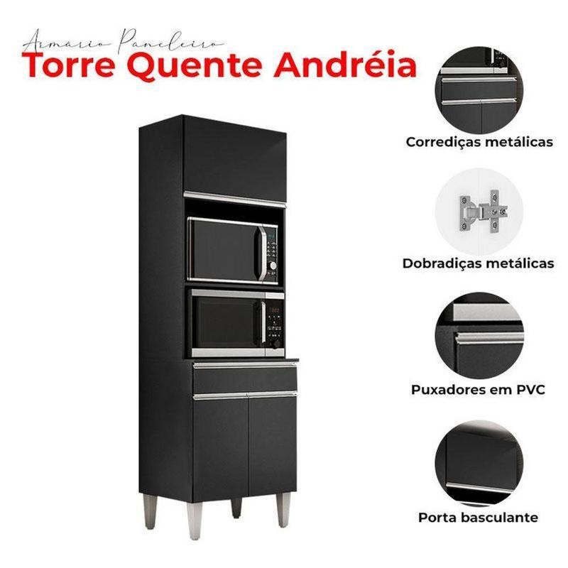 Armário Paneleiro Torre Quente 2 Fornos Ambiente Andréia Preto Fosco - AjlArmário Paneleiro Torre Quente 2 Fornos Ambiente Andréia Preto Fosco - AJLEstá montando sua cozinha? Apresentamos para você este belo armário torre quente da linha Andréia. Possuindo três portas, sendo uma basculante, além de uma gaveta com corrediças metálicas, proporcionando um deslizamento suave e seguro. O destaque fica por conta dos dois nichos, com espaço para acomodar seu microondas e outros eletros de forma prática e organizada. Com puxadores e pés em PVC, alia robustez com facilidade na hora da limpeza. Fabricado pela AJL, é desenvolvido em 100% MDP, será uma excelente opção para complementar sua cozinha com estilo e funcionalidade. Aproveite e garanta já o seu!Características Técnicas:- Desenvolvido em 100% MDP - Acabamento em pintura UV na cor Preto Fosco - Possui 2 portas - Possui 1 porta basculante - Possui 1 gaveta - Possui 2 nichos - Dobradiças metálicas - Pistão a gás - Corrediças metálicas - Puxadores em PVC - Pés em PVC - Amplo espaço interno - Design modernoDimensões: Altura: 202 cm Largura: 60 cm Profundidade: 51 cmOBS.: Não acompanha decorações, utensílios, eletros e acessórios.Informações importantes: *Imagens meramente ilustrativas, cores e estampas podem variar conforme lote. *Não realizamos a montagem ou instalação do produto, porém acompanha manual de instruções. *Toda mercadoria segue segurada contra qualquer sinistro, em caso de anormalidade, recuse. *Conferir a quantidade de volumes. *As caixas ou pacotes possuem identificação com o nome, cidade e quantidades de volumes relativos à compra para conferencia. NA